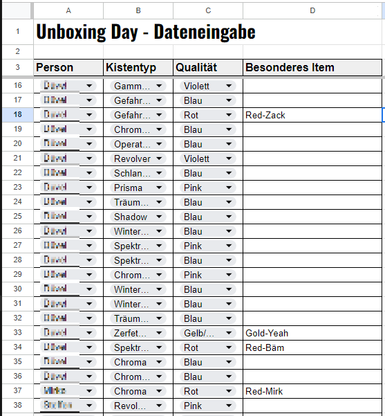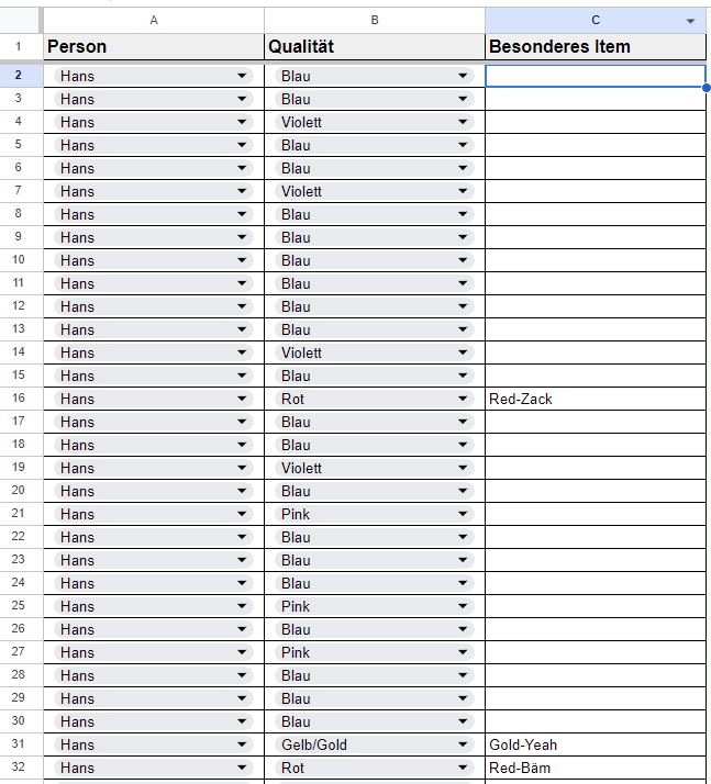 ich erstelle - total unwichtig und für den Zweck absolut drüber - eine Auswertung in Google Tabellen und kann ein Problem nicht lösen. Kurz formuliert: