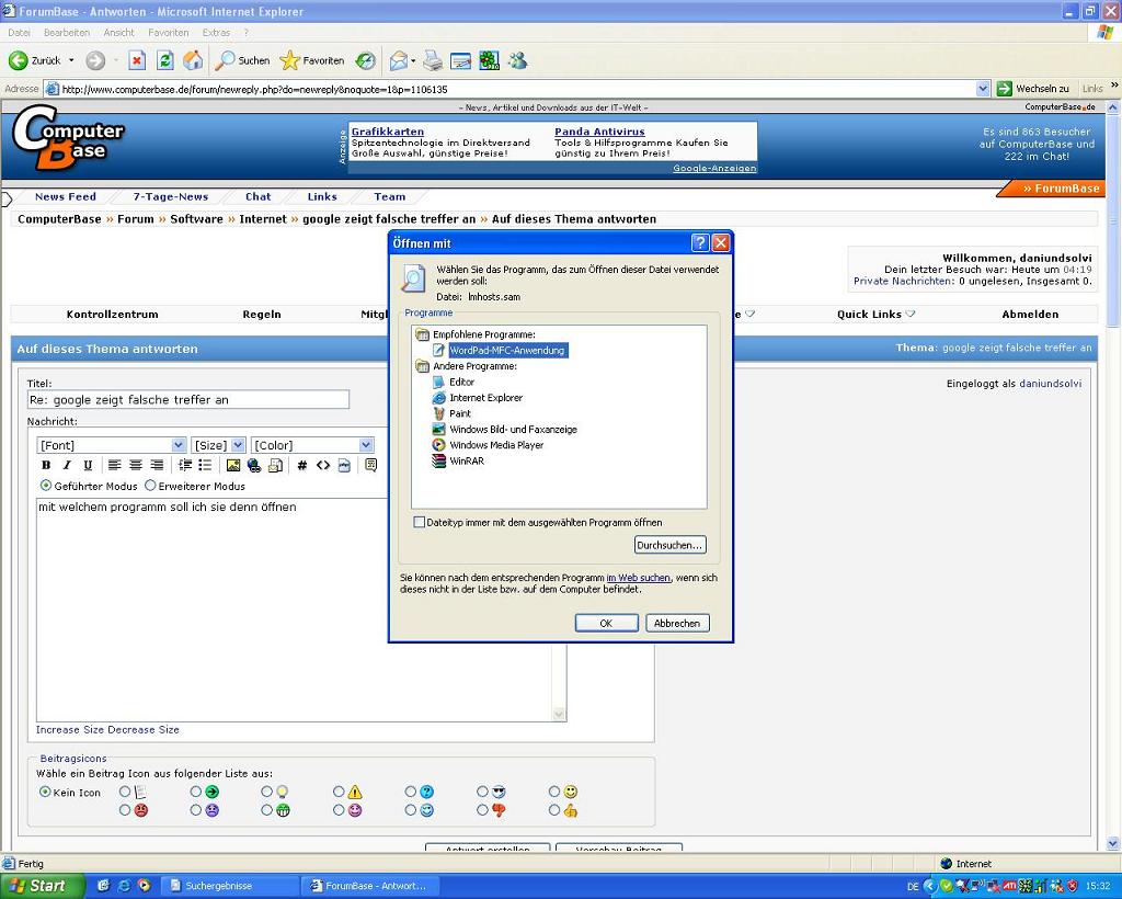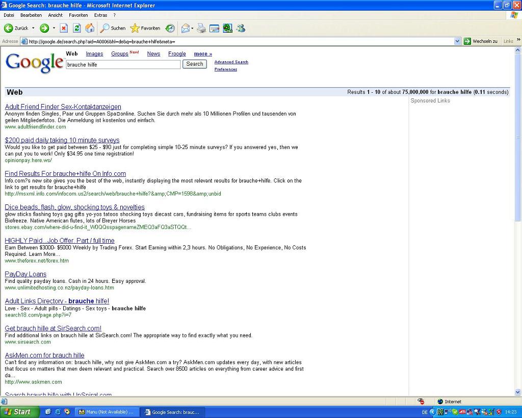 Hall ich habe ein Problem ich hatte mir gestern abend irgendwie etwas komisches eingefangen(web-search.com)hab es aber mit cw Shredder entfernt.Ich glaube es war ein spyware oder so,aufjedenfall verhält sich seitdem google.de merkwürdig wenn ich zb in die Suchleise etwas eintrage(zb brauche hilfe)kommt immer ein seite wo etwas komische beschrieben steht,aber das will ich gar nicht wissen.Irgendwas mit Aldultfinder.com und so es sieht so nach pornoseiten aus wollte sie aber noich nie anklicken.Ich hoffe das mir jemand helfen kann wäre sehr dankbar wenn die Suchfumnktion bald wieder richtig funktioniert