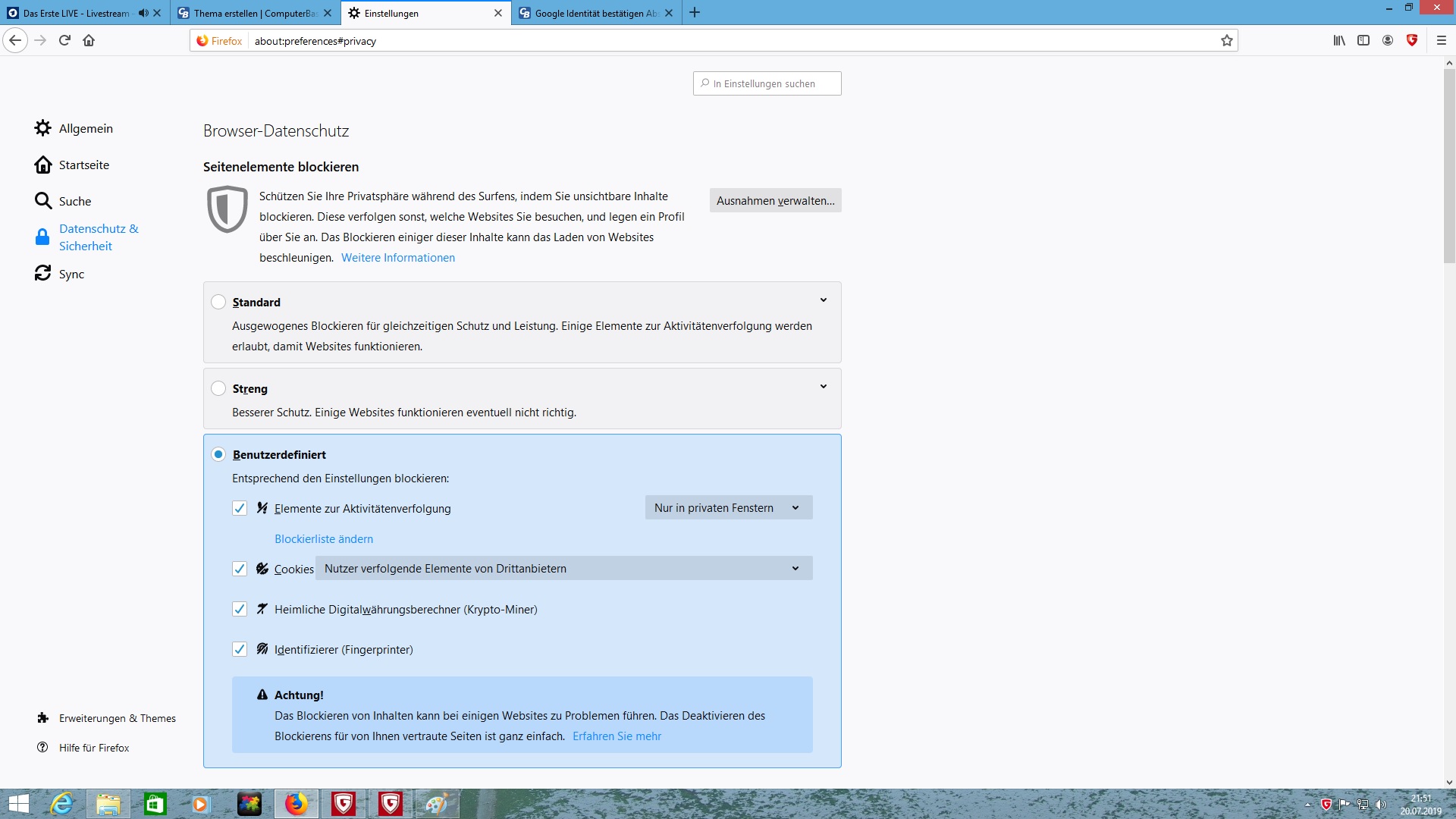 Die Einstellungen bei "Datenschutz & Sicherheit" habe ich alle schon mal abgeändert, d.h. zunächst hatte ich die Einstellung auf "streng", dann abgeändert auf "benutzerdefiniert", und prompt ging es wieder, die Betonung liegt aber auf ging.