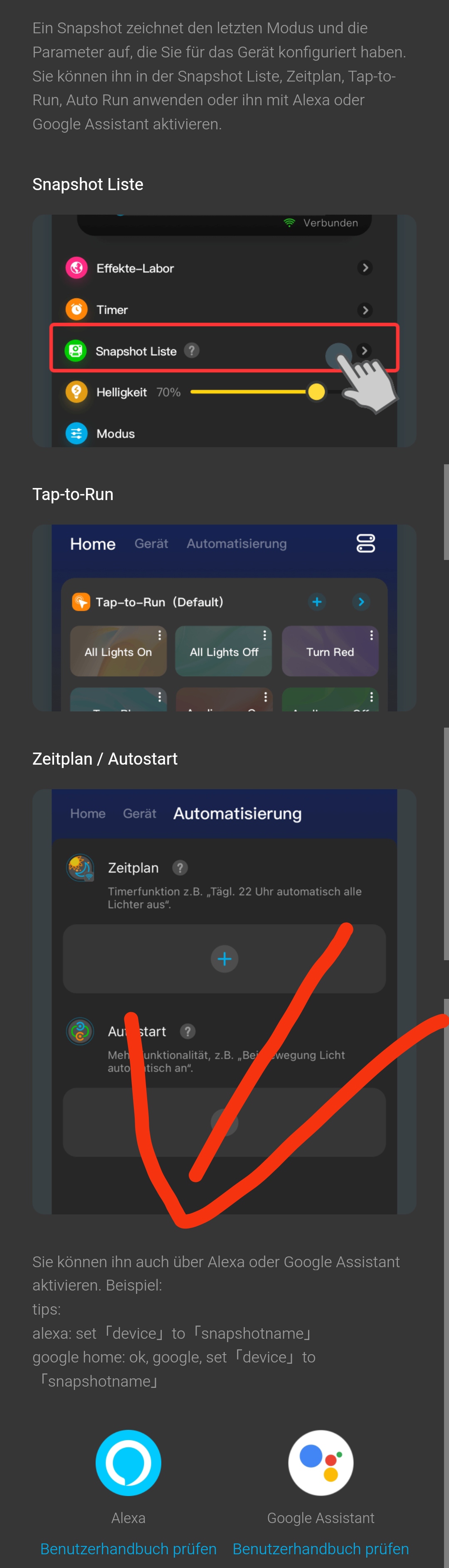 Voreingestellte Dinger wie schalte XY auf Rot etc pp geht, nur halt nicht die eigenen snapshots welche für uns als einziges relevant sind.