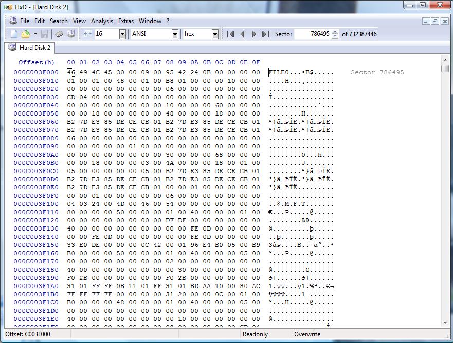 Sieh mal mit Positionierung auf Sektor 786495 nach , was da in der ersten Zeile steht - fängt die mit "FILE0..." an?