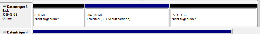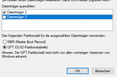 Wenn ich die mit "GPT" Initialisiere, habe ich sofort eine Schutzparititon von 2 TB drauf und kann überhaupt nichts mehr damit anfangen.