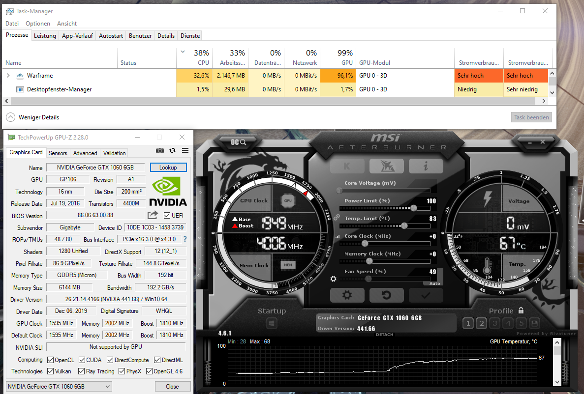 Hier ein mal meine GPU im Idle und mit Warframe: