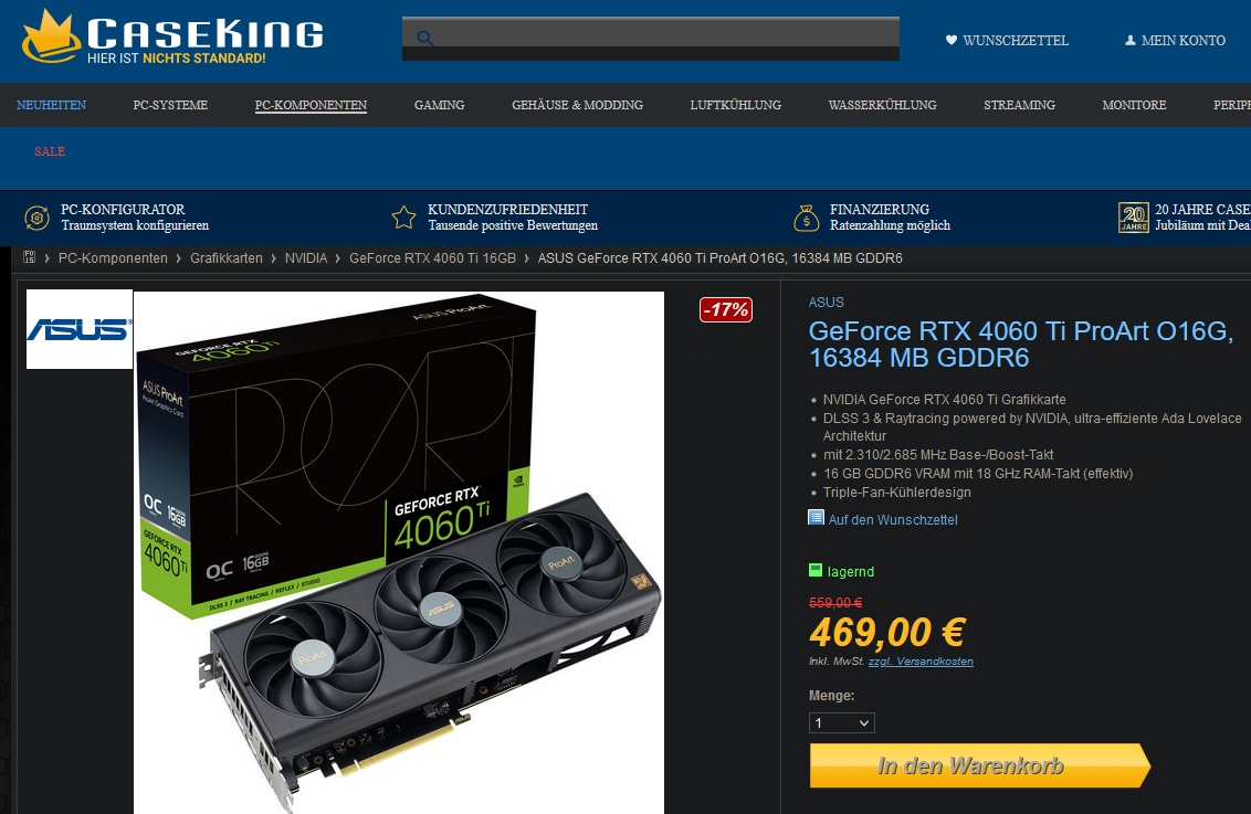 Aktuell gibt es die ASUS GeForce RTX 4060 Ti ProArt O16G, 16384 MB GDDR6 für 469,00 Euro abzüglich Asus Cashback 50,00 Euro = effektiv 419,00 Euro