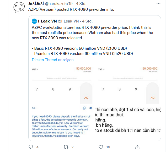 Angeblich sind das aktuell nur die Platzhalter Preise, da Preis nicht bekannt. IMO kann es aber sein das diese Preise gar nicht so weit weg sind von der (kommenden) Realität. Die 4090 soll ja >80% schneller sein als die 3090. Wenn man die 3090 aktuell für >1K€ los wird, worum eine 4090 für weniger als 2K€ anbieten?ASCORBIN schrieb:Das ist Preislich aber echt hart ^^“