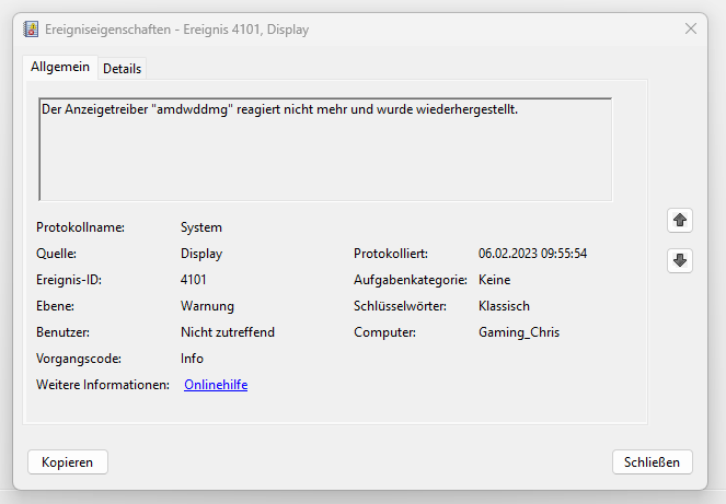 Nach einem Neustart genau das gleiche Spiel. Ich hatte gestern Abend noch gezockt, nichts installiert, nicht verändert, einfach nur runter gefahren und heute früh zickt der AMD Grafiktreiber oder die AMD Grafikkarte, eins von beidem.