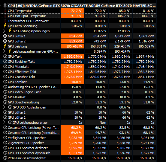 Ich bewege mich bei meinem Spiel bei einer GPU-Temperatur von etwa 79-82 Grad. Ich kann nicht sagen, ob es an der Temperatur liegt, oder an irgendetwas anderem, aber, wie gesagt, fängt die Grafikkarte auf einmal an extrem zu pusten. Ich gehe davon aus, dass es die Temperatur ist, da sie es nicht tut, wenn ich bspw. nicht spiele oder ein Spiel mit noch weniger Leistung spiele und ich nur so bei 50-70 Grad unterwegs bin.