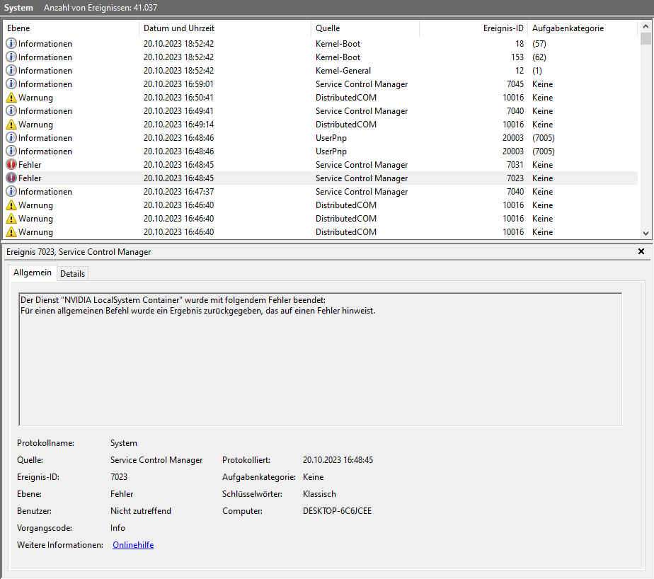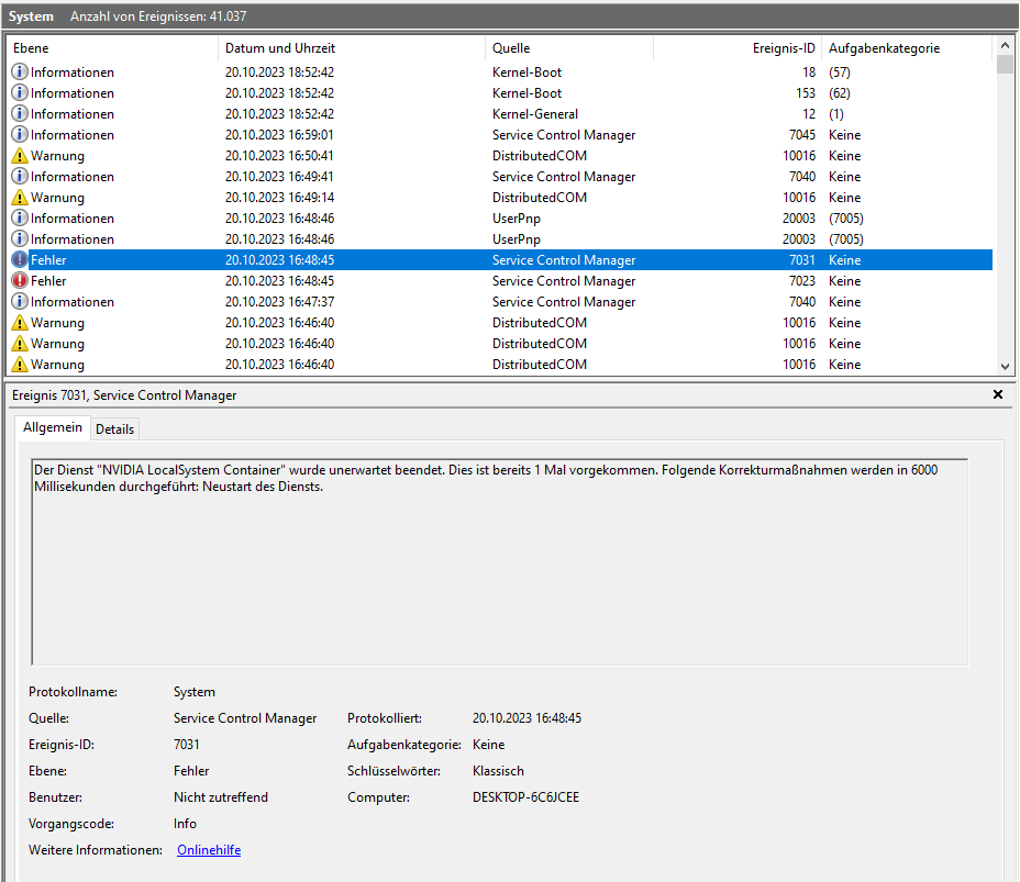 Ereignisanzeige (ich glaube das müsste unter System gelistet werden, ansonsten Anwendung), ob es einen Fehlereintrag zum Nvidia Treiber gibt
