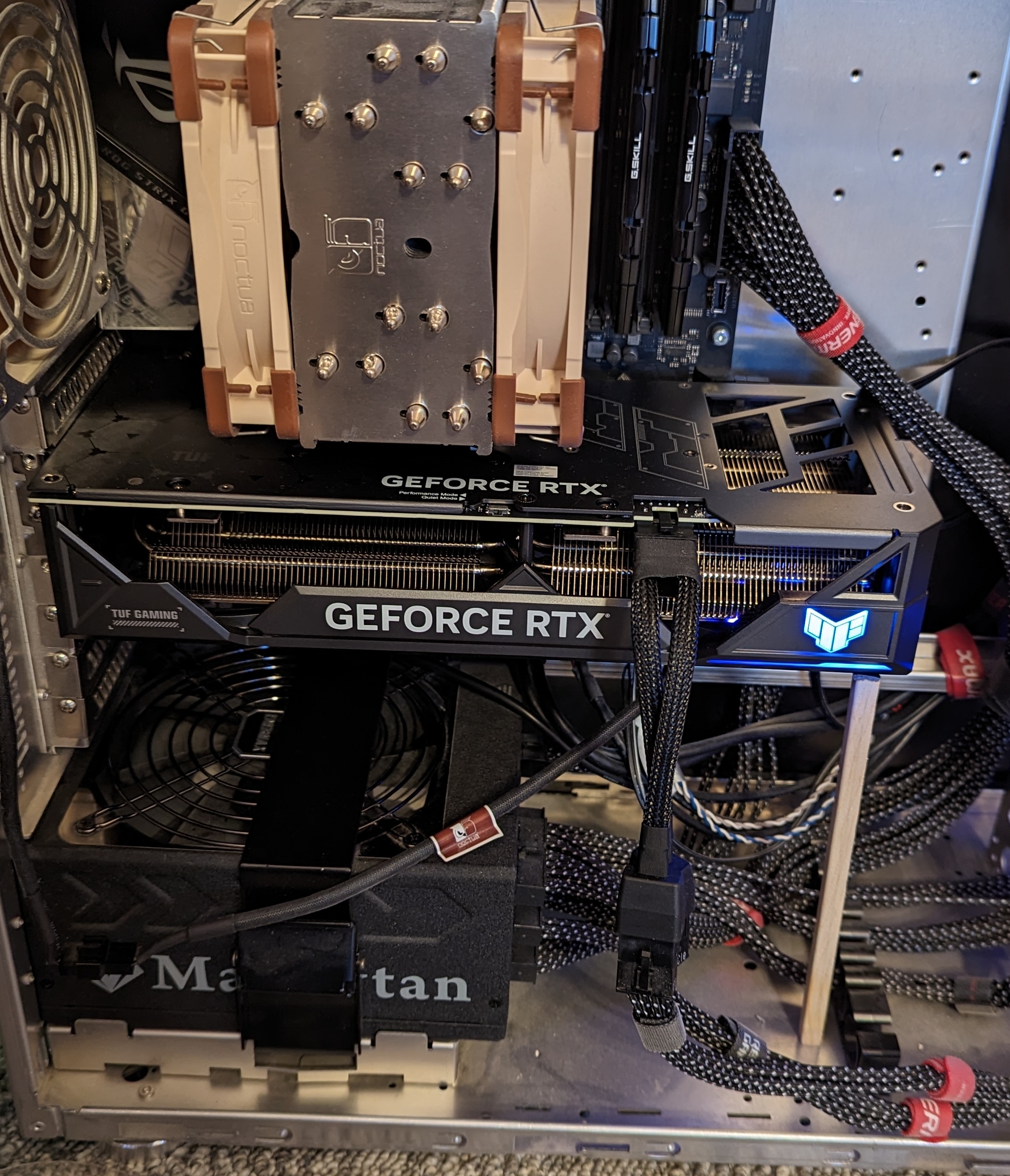 Durchhängen an sich ist aber nicht kritisch, meine 7970 Crossfire haben bestimmt 6 Jahre lang 0,5cm durchgehangen (von Blende bis Case vorne) und laufen beide heute noch (auch wenn sie jetzt gerade liegen).