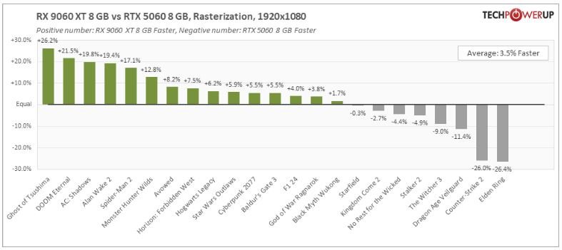 You can clearly see this in many tests—once the NVIDIA card runs out of VRAM, it drops much harder than AMD's Radeon—quite unexpected. Part of the reason for this could be that the NVIDIA RTX 5060 and 5060 Ti use a PCI-Express x8 interface, which offers only half the bandwidth of x16 on the RX 9060 XT. While this doesn't matter much for normal gaming, it becomes a bottleneck when out of VRAM, because the VRAM overflow will get copied to system memory. The GPU needs the bits for every frame though, so data is flowing across the PCIe bus at a high rate when VRAM is scarce, which of course means that available PCIe bandwidth becomes more relevant. I'm not fully convinced that this the whole answer. In my testing of the RTX 5060 8 GB models I noticed that they generally fail sooner and harder than competing GeForce 40-series 8 GB models, which is unexpected.