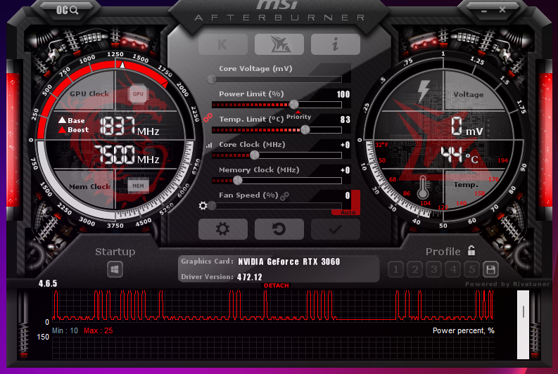 Ich sehe mommentan im Msi Afterburner, das Gpu clock und mem clock immer ganz plötzlich aufs maximum hoch schießen und die obwohl ich nur youtube schaue.. Begefügt unten ein Bild. Zusätzlich habe ich nie konstante fps. (Beispiel Minecraft: Ohne Begerenzung ungefähr 500fps, aber sobald ich auf 150fps cappe, bleibt es nie konstant auf 150, sondern droppt immer runter.) Ausserdem ist die Grafikkartie NIE auf 100% laut msi afterburner.