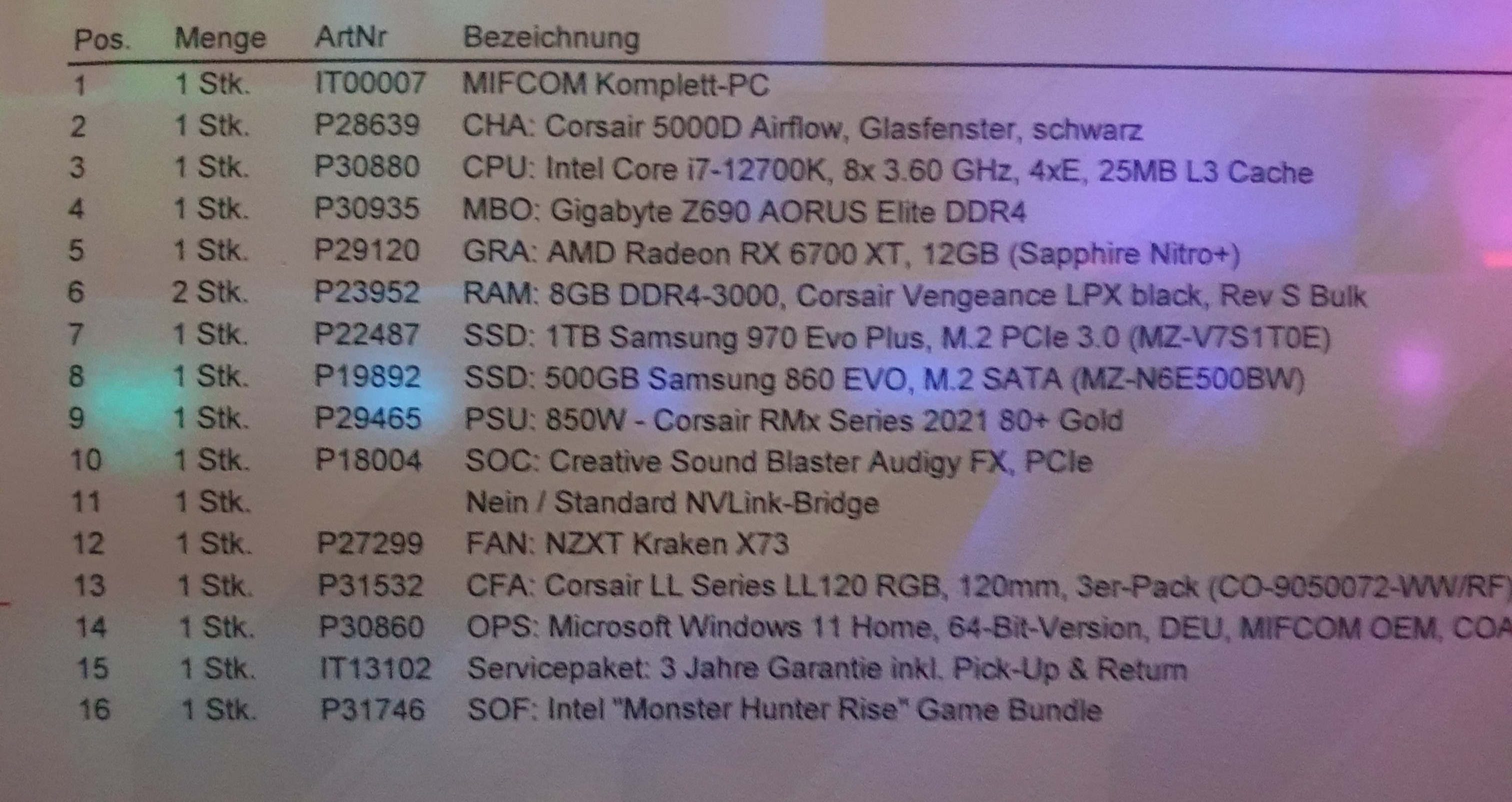 - Prozessor (CPU): …Intel Cire i7-12700K, 8x 3.60 Ghz 4xE, 25MB L3 Cache