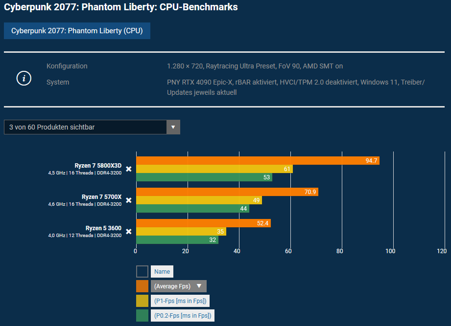 Wenn die GPU nicht die gewünschte Framerate erreicht, muss man die Settings entsprechend anpassen und nicht alles auf Ultra stellen. Im CPU Limit bringt das jedoch nichts. Die Benchmarks und Anforderungen zeigen, dass der Ryzen 3600 unabhängig von der GPU zu langsam für Cyberpunk mit RT ist.