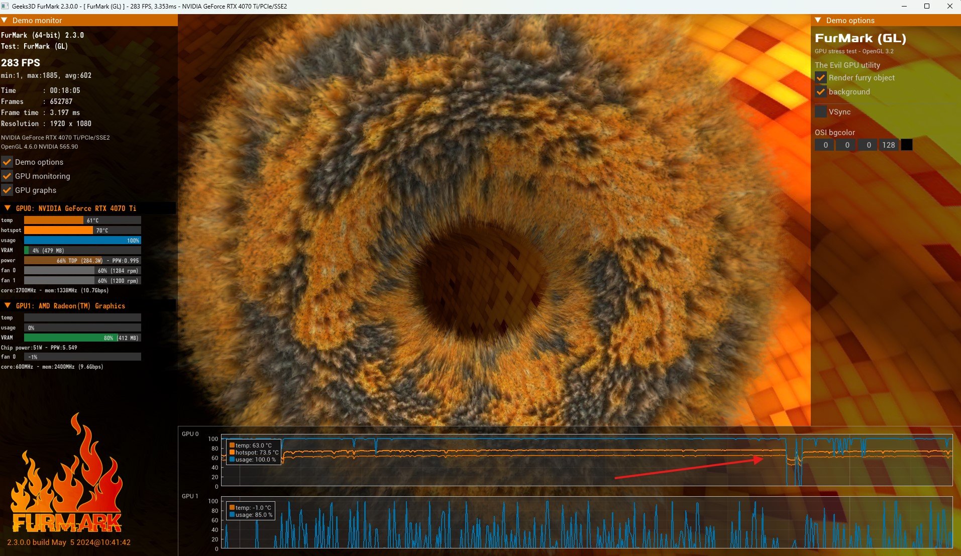 Mit dem Tool "FurMark" habe ich herausgefunden, dass die GPU Usage in diesen Momenten sehr kurzzeitig auf 0% fällt. Auch hiervon habe ich einen Screenshot erstellt (siehe Verlauf der oberen blauen Linie).