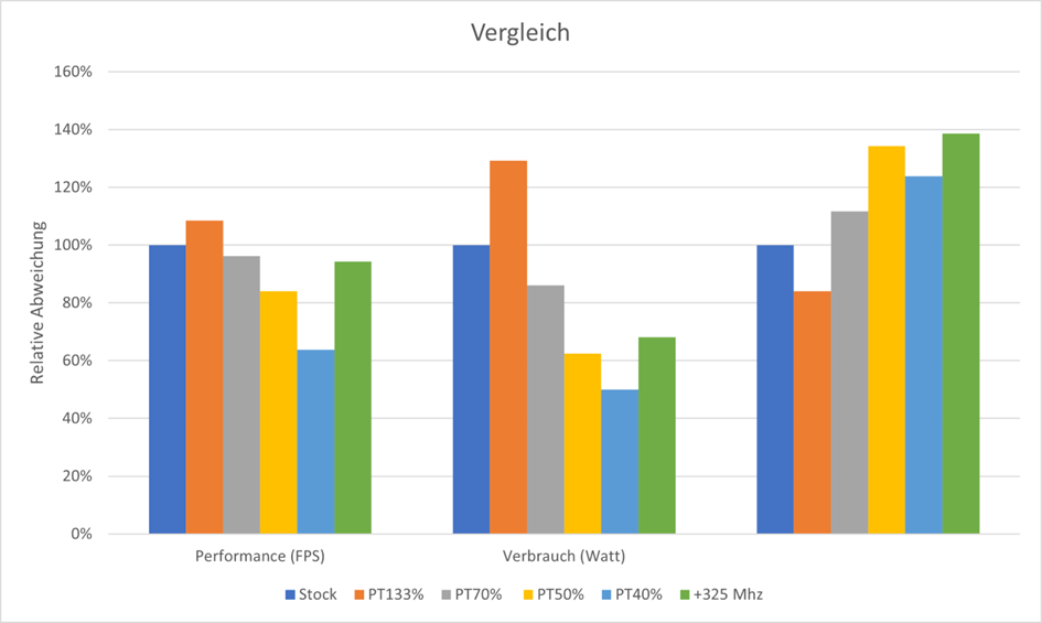 Einzig ein Power Target von 40% zeigt nochmals einen merkbar geringeren Verbrauch. Jedoch bricht auch die Leistung überproportional ein.