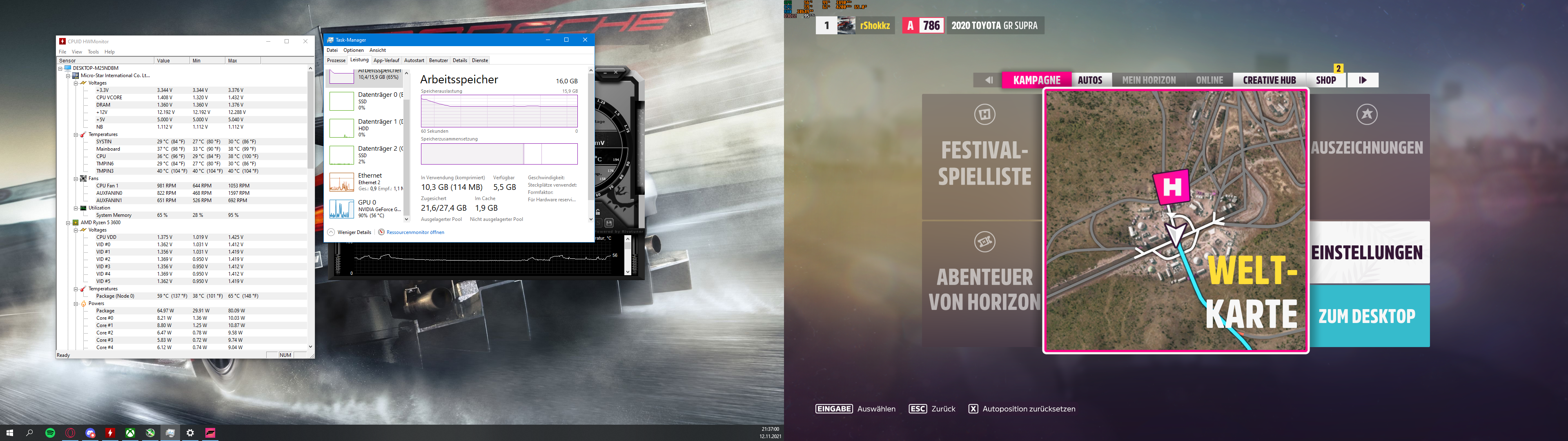 Speicher : 500gb M.2 Nvme Kingston, 500gb Crucial Mx500 ( hier ist auch forza installiert), 1TB HDD als Datengrab