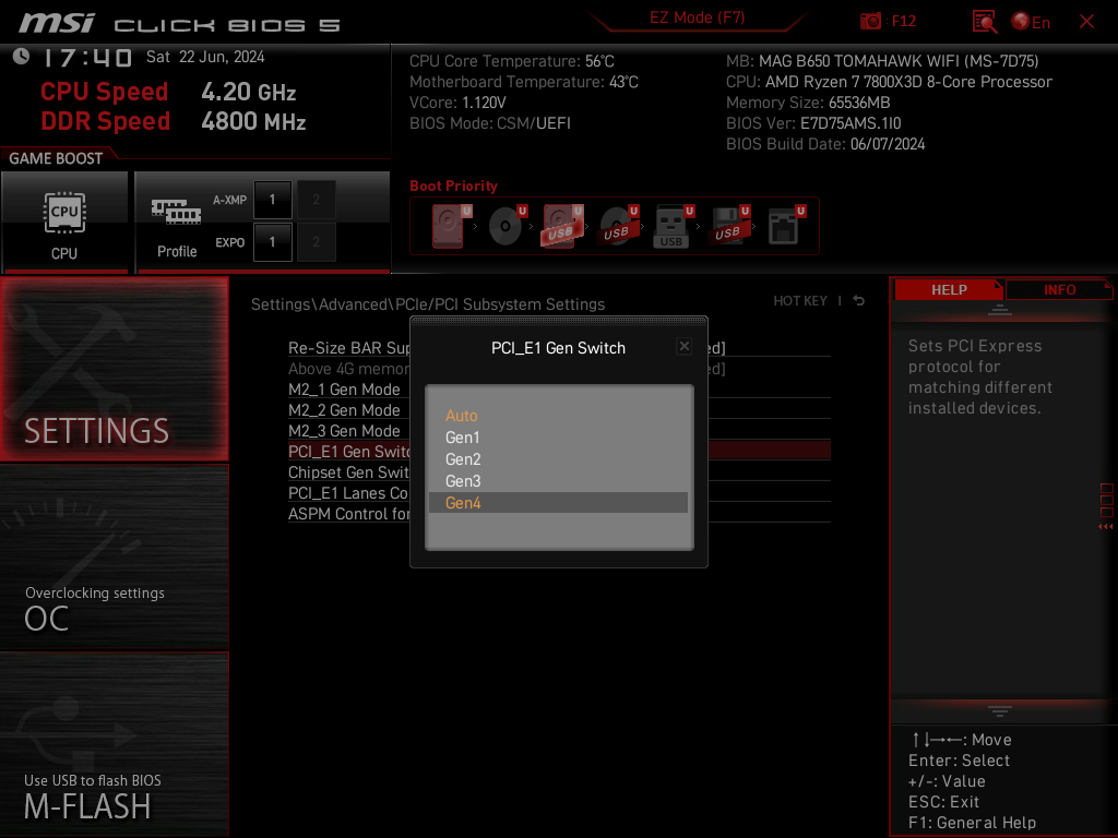 Ich habe mein BIOS dann vorhin auf die neuste Version (7D75v1I) geflashed. Gleichzeitig habe ich in den BIOS-Einstellungen die PCIe-Generation fest auf Gen4 eingestellt (Default-Setting: Auto; siehe Screenshots).