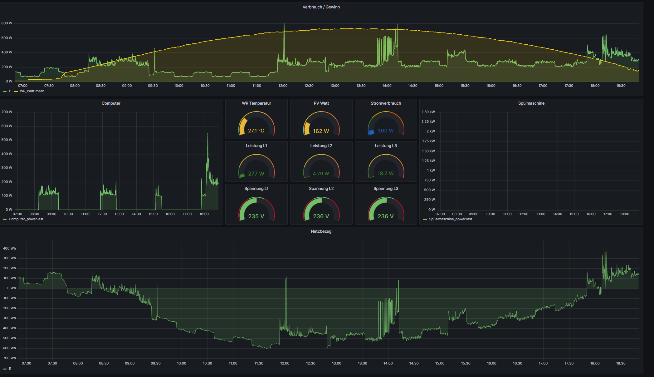 ich habe mir mit einer Raspberry und Shellys ein Grafanaboard erstellt. Die Daten werden über MQTT eingesammelt, gehen ins NodeRed, dann in die influxDatenbank und werden dann in Grafana visualisiert.