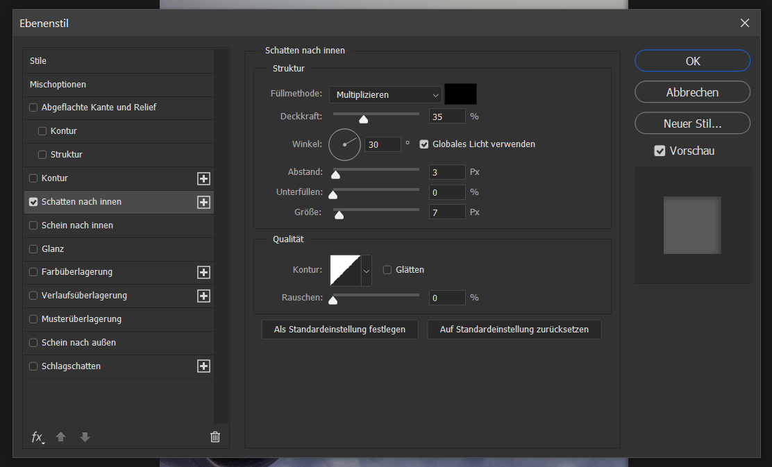 findest du in den ebenenoptionen wenn du doppelt auf das ebenen logo klickst. dann kannst du links im menü verschiedene stile auswählen. einfach mal mit den optionen rumspielen und gucken welche auswirkungen es hat.