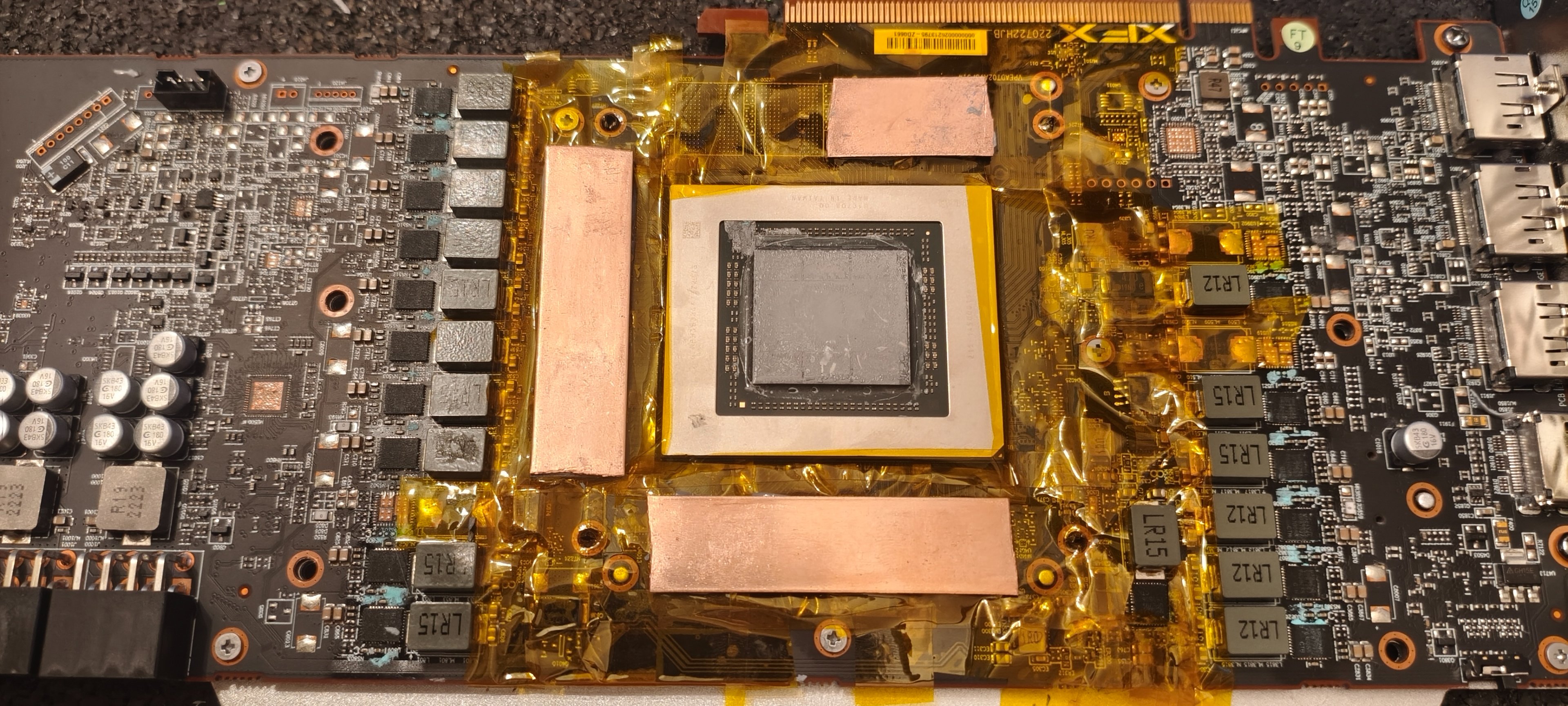 Habe dummerweise eine Kupferplatte vergessen runter zunehmen (VRAM auf der PCIE Seite), danach kamen die Fehler. Die beiden VRAMs am Slot 10min mit 130°C erwärmt (alles drumherum war abgeklebt). Karte lief für 2 Wochen ohne Fehler (zumindest solange der VRAM nicht übertaktet wurde, bzw nur bis zu einem gewissen Punkt, der weiter unter dem normalen Niveau lag), kamen dann wieder. Erneutes Erwärmen hat nichts gebracht. Karte weg gegeben, da wurde wohl etwas unter dem Mikroskop gesehen (was weiß ich nicht) wollte man nicht reparieren. Nochmal weggeschickt, wohl irreparabeler Prozessorfehler. Geht das überhaupt bei dem Problem?