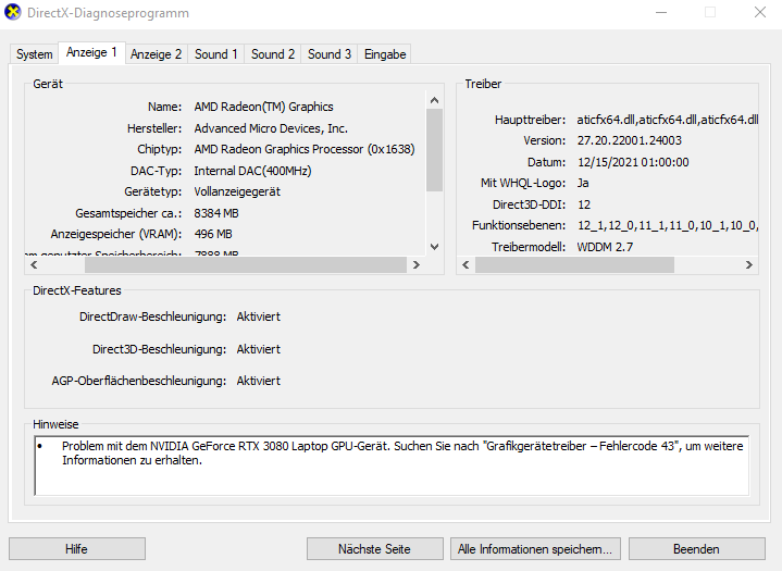 Nichts hatte bleibenden Erfolg. Ausschließlich das de- und reinstallieren der Grafikkarte hat dazu geführt, dass mir die Fehlermeldung 43 nicht mehr angezeigt wurde. Die Grafikkarte war dennoch ausgeschaltet und nach dem öffnen eines Spiels oder eines Neustarts von Wndows war die Fehlermeldung wieder da.