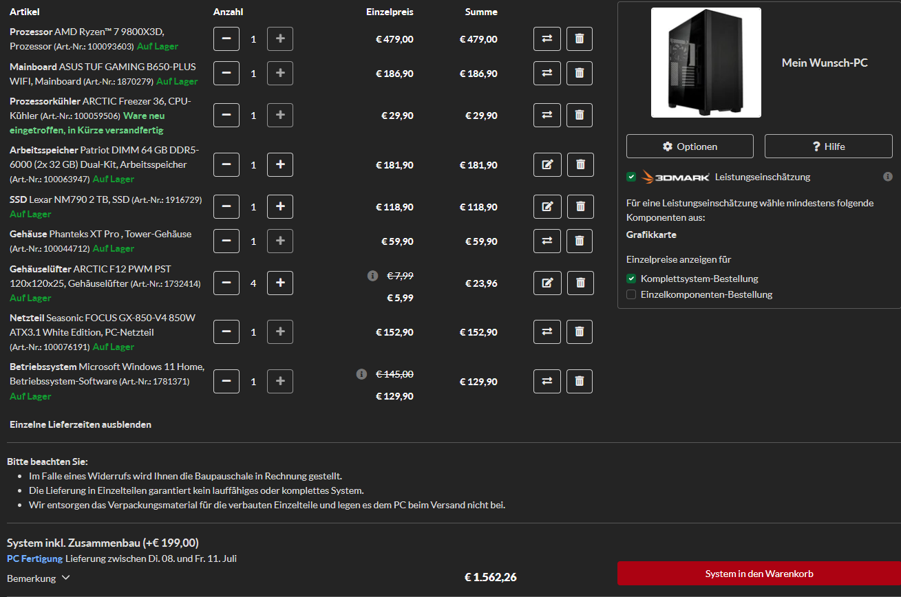 - Prozessor (CPU): … Ich wollte mir einen PC zusammenbauen lassen bei Alternate, hab also noch keine genauen Daten. Aber es wird wohl ein Intel Core Ultra 7 265K, Ich hab fast alle Komponenten zusammen, es fehlt nur noch Mainboard (ist KI Lüftersteuerung zu empfehlen wegen des Pumpens und Knopf am Gehäuse wegen Rücksetzen des Bios und Flash Bios Button?), dann noch Monitor und natürlich Grafikkarte.