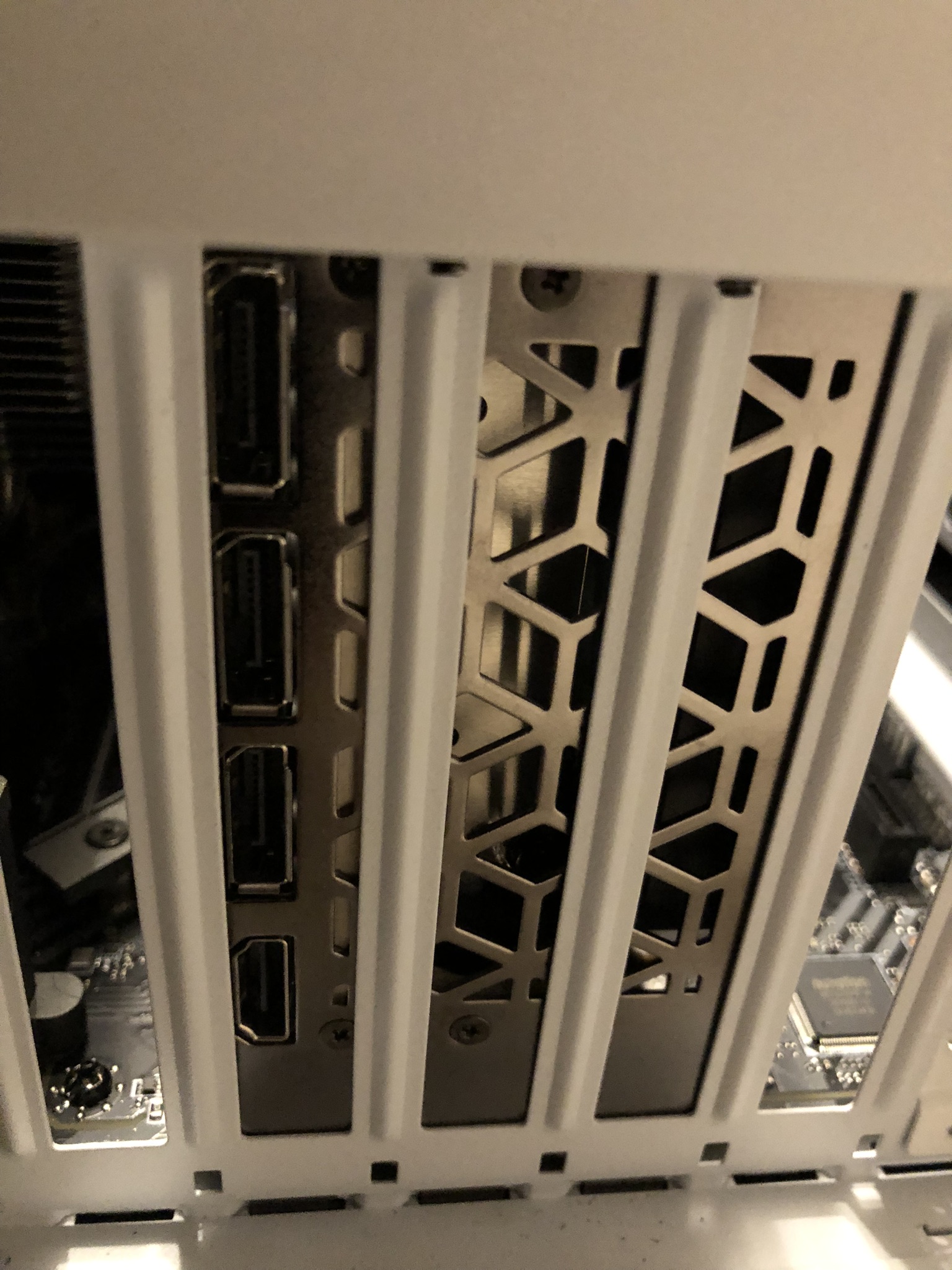 In den Ausgängen der Grafikarte (HDMI etc.) waren noch die Schutzkappen drin. Da musste ich anschließend die Querstrebe etwas nach außen biegen, damit die Schutzkappen entfernt werden konnten.