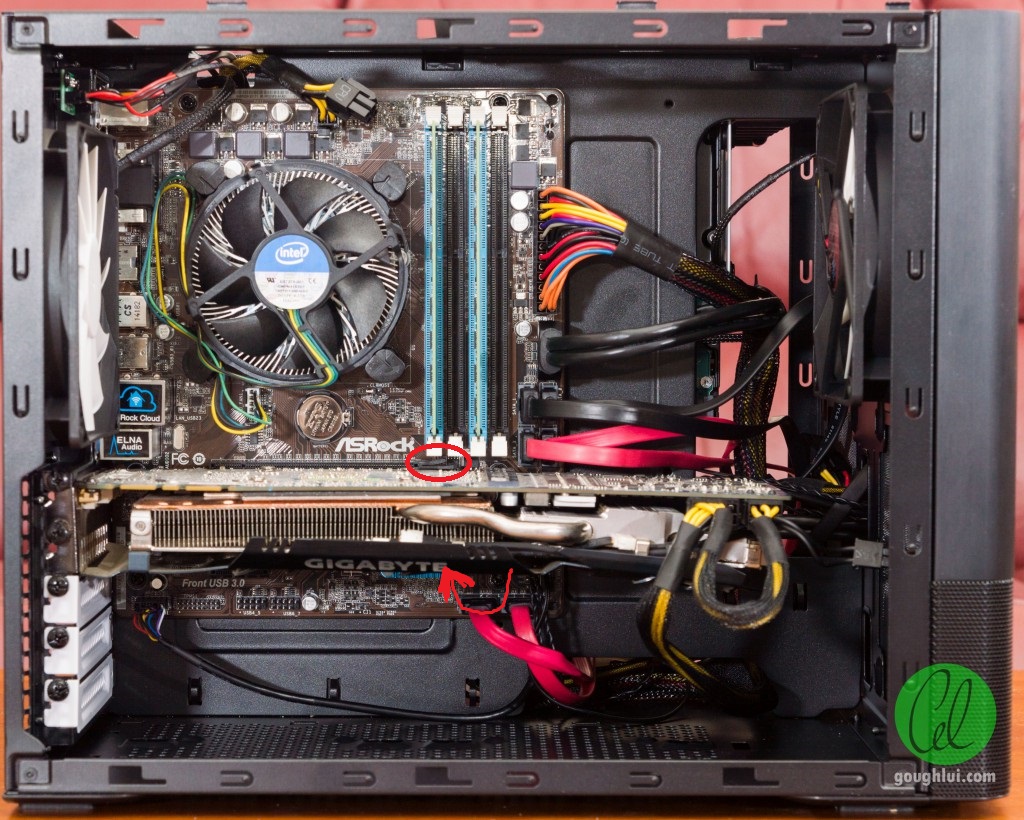 ich hab mal ein Bild eingefügt, meine Grafikkarte steckt ganz unten, direkt über dem blauen Teil.