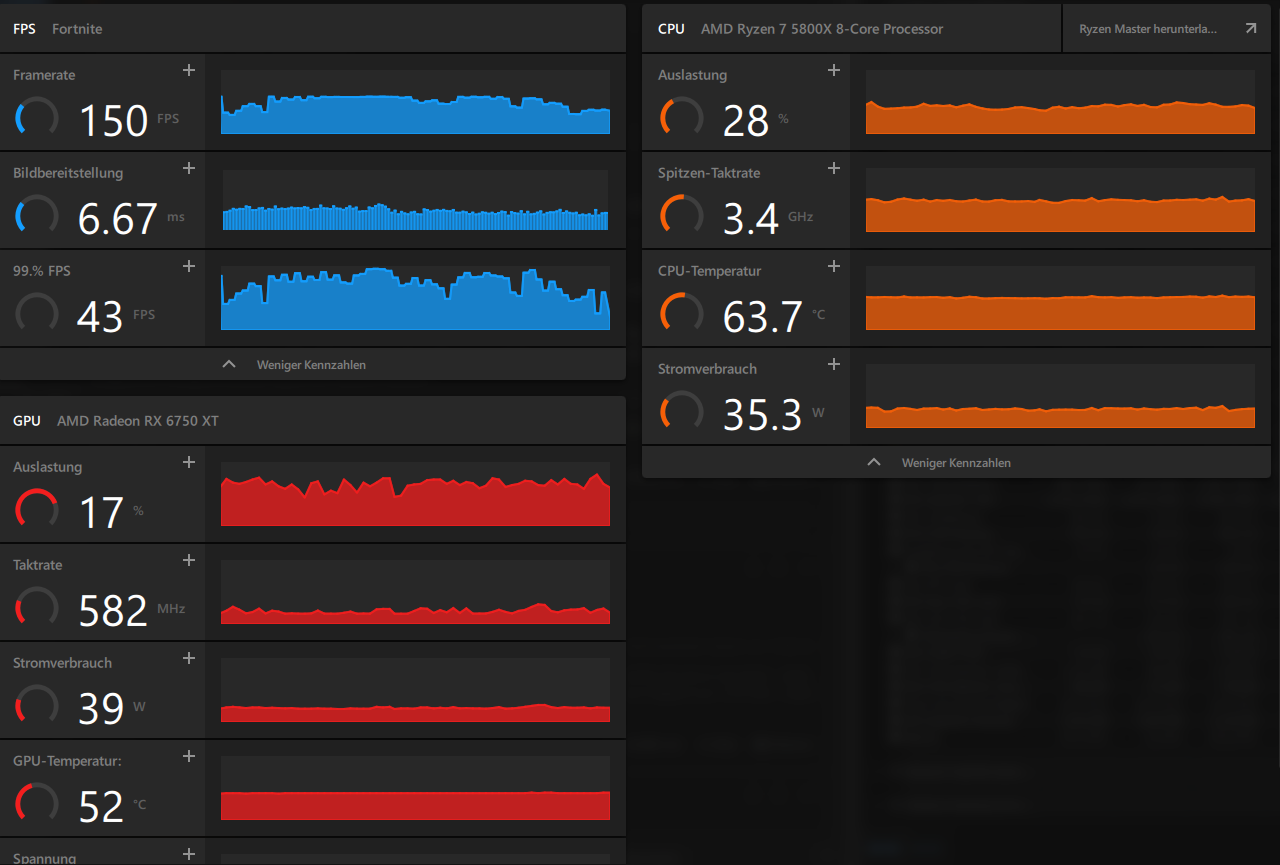 Geh nochmal in Fortnite und poste mal die nötigen Graphen von MSI Afterburner, damit wir alle Auslastungen mal sehen könnnen. Dann stelle testweise auf maximum Details und mach das ganze nochmal.