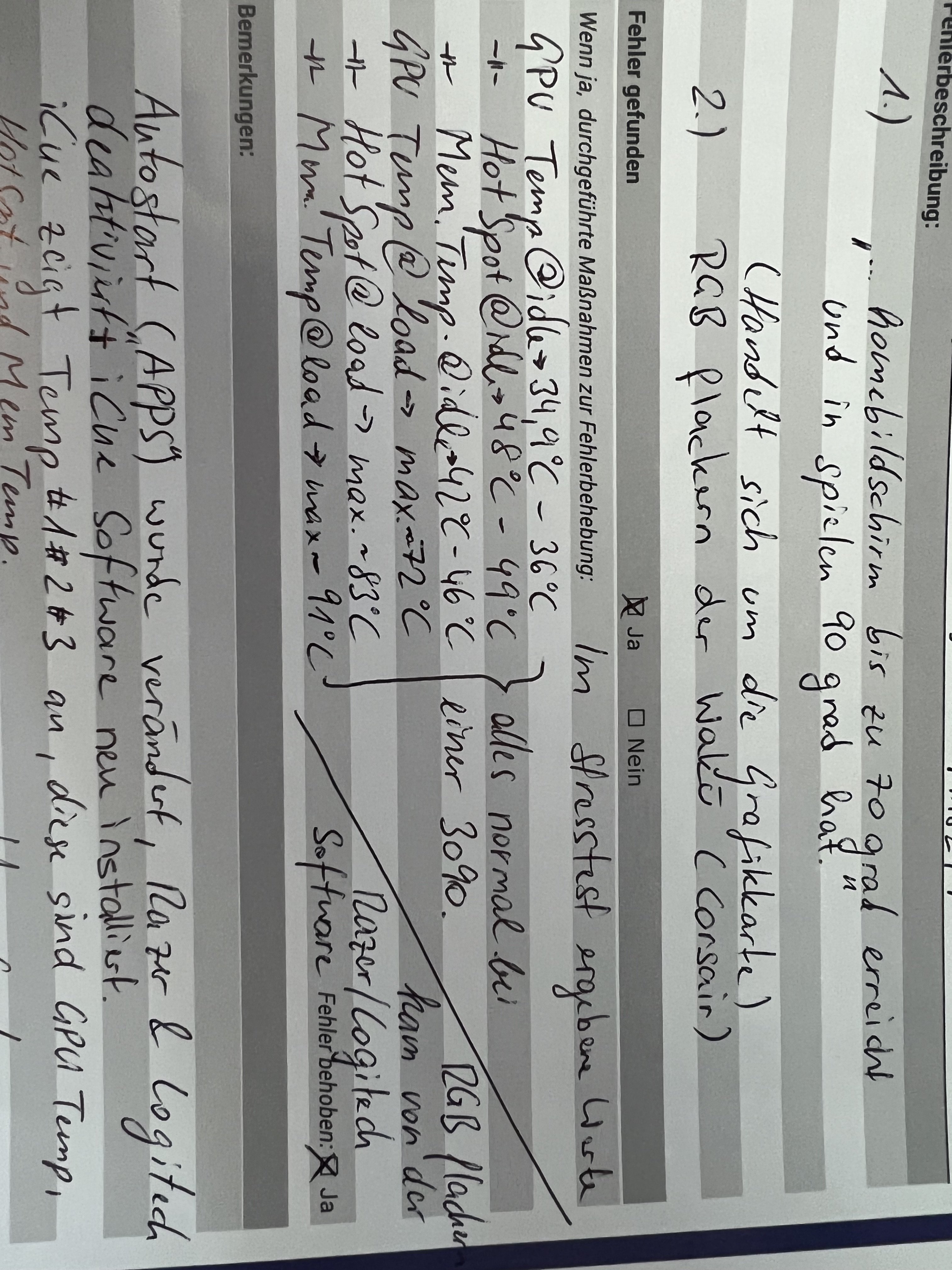 Ich dann: auf dem Desktop habe ich auch einen Screenshot von der Fehlermeldung der Grafikkarte. Es kann ja nicht normal sein das die Grafikkarte an die 90 Grad erreicht und ich jeden Monat den PC einschicken muss, irgendwas muss da ja sein. (Im Anhang zu finden)