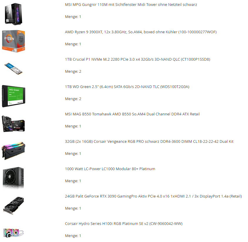 - Prozessor (CPU): AMD Ryzen 9 3900XT, 12x 3.80GHz, So.AM4, boxed ohne Kühler (100-100000277WOF)