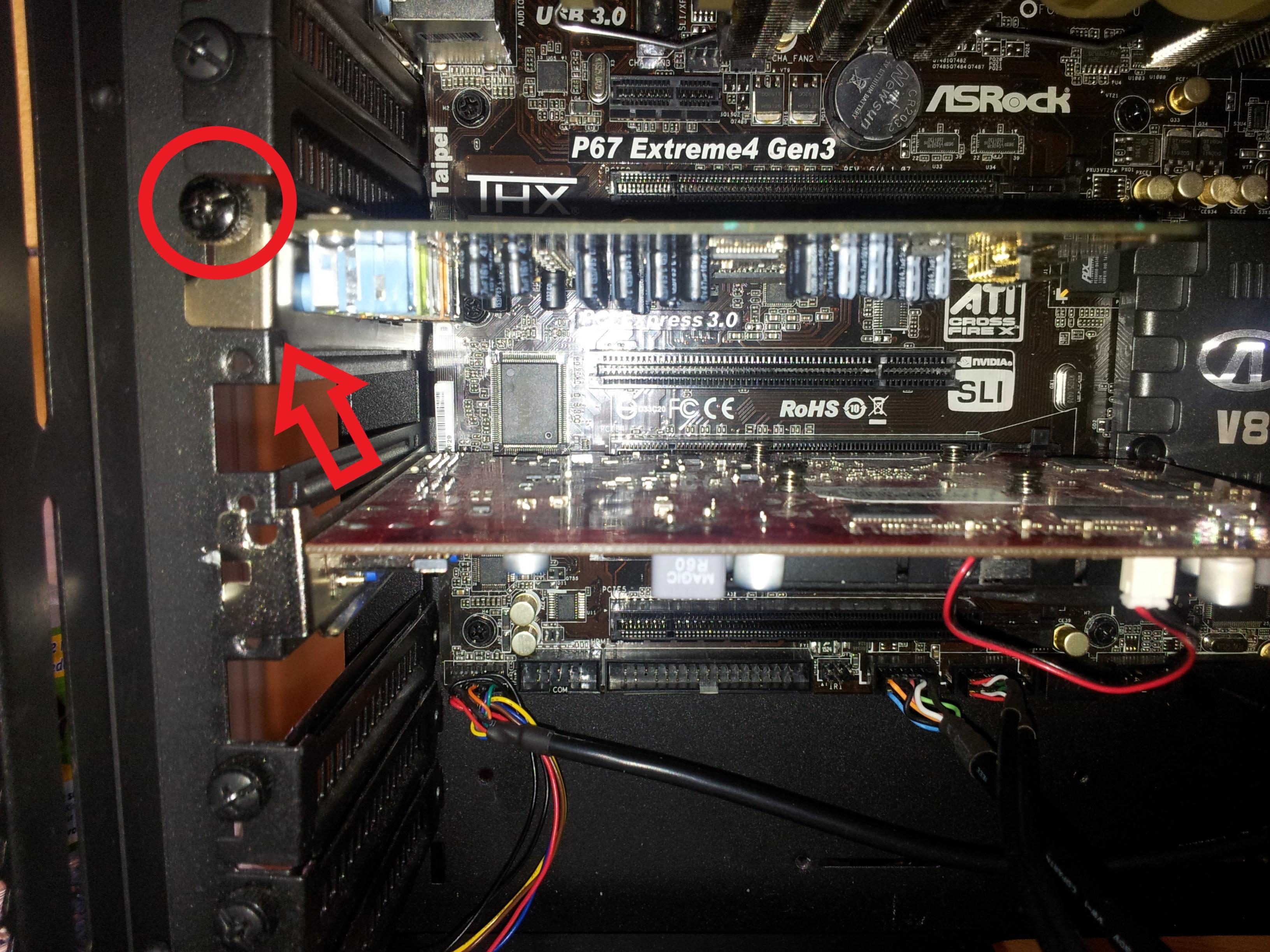 keine von den Schrauben auf dem Bild, sondern die Schraube wo die Grafikkarte mit dem Gehäuse verbunden ist.