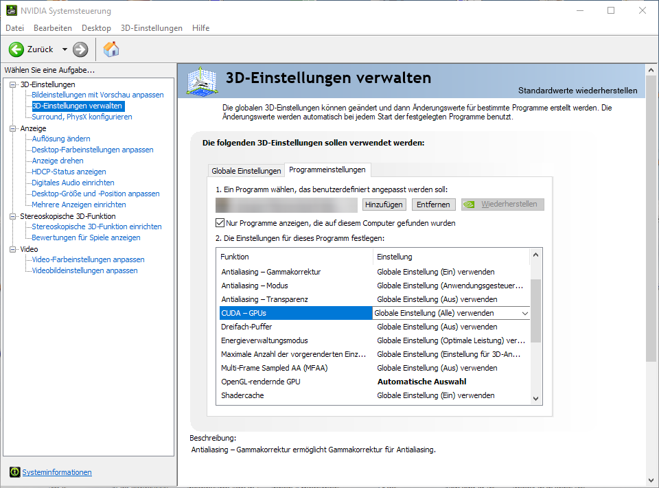 Habe dann auch schon mal in die NVIDIA-Systemsteuerung gekuckt, da finde ich allerhand, aber kein Dropdown-Menü, in dem ich die Grafik-Einheit für ein Programm fest legen kann (siehe Screenshot). Hat jemand eine Idee, wie ich den Treiber/Windows dazu "zwingen" kann, das Programm mit der NVIDIA Karte zu starten?