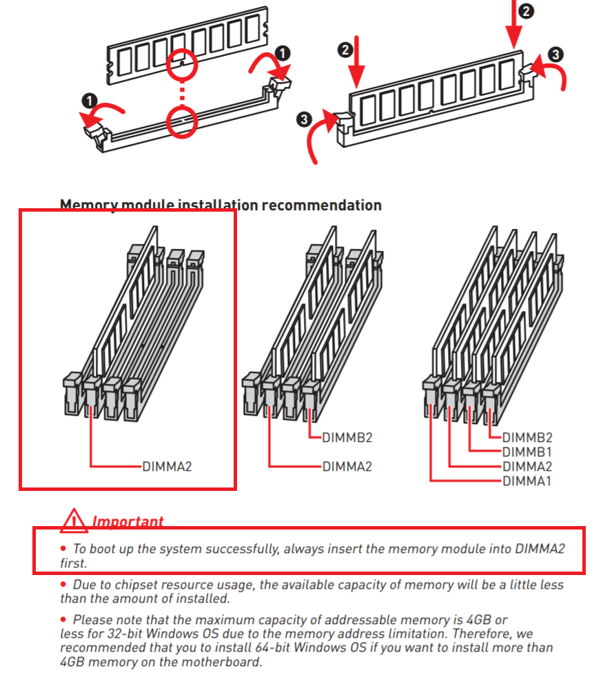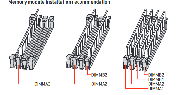 Hast du mal versucht nur mit einem Ram Slot (DIMMA 2 laut Handbuch) zu starten ?