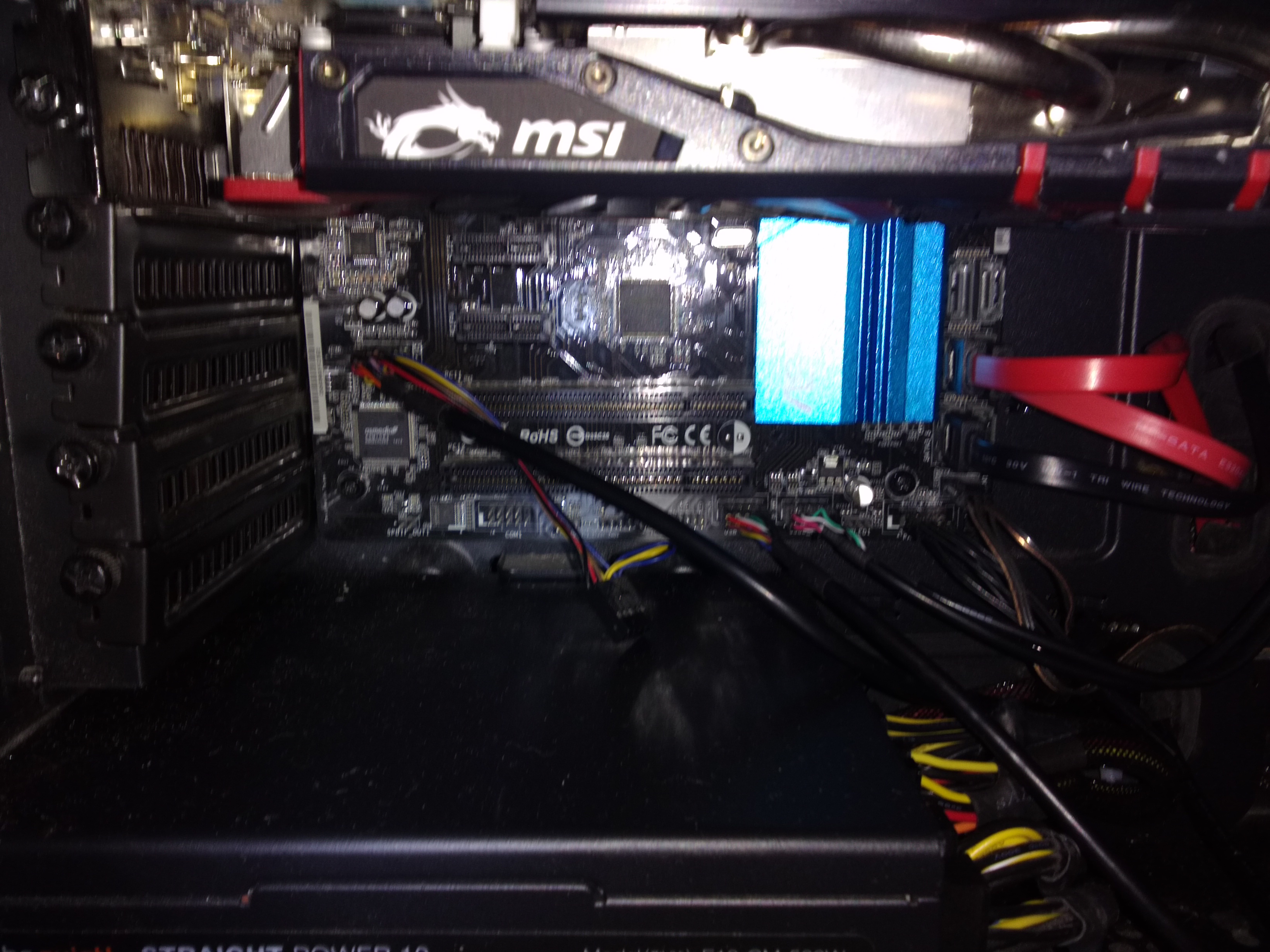 Der PC scheint zu booten, die LEDS gehen an, die Lüfter drehen, es kommt auch ein Geräusch, was vor dem Auseinanderbau kamm, als ich ihn bootete. Die LEDS der Grafikkarte erleuchten ebenfalls.
