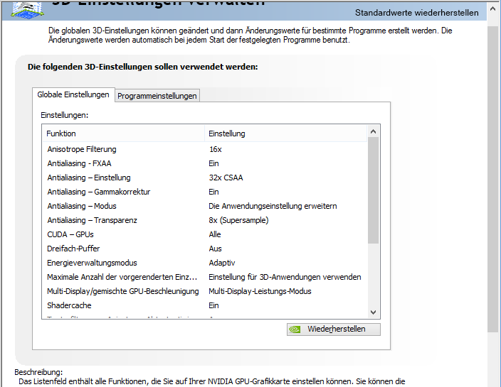 Und zwar hab ich folgendes Problem mit dem Antialiasing in den Spielen, egal welches spiel die Kantenglättung ist weg und ich bekomme langsam augenkrebs ^^ .. ich hab schon Versucht in den nvidia systemsteuerung alles hochzudrehen aber das Bild bleibt gleich, es ist nur das Bild ingame das schlecht ist, Bilder Schrift usw ist alles scharf, und ich Spiel die Spiele auf Ultra.