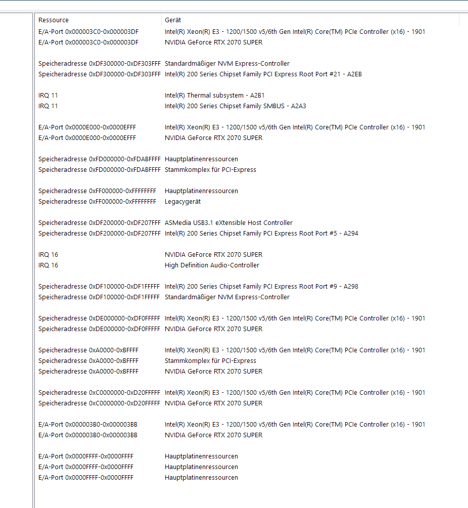 Dann bin ich durch einen anderen Forumsbeitrag auf den "Konflikte/Gemeinsame Nutzung" Teil in den Systeminformationen gestoßen. Dort hab ich dann eine gem. Nutzung zwischen der Grafikkarte und dem HD Audio-Controller auf einem PCIe-Slot festgestellt (siehe Anhang). Das habe ich dann versucht zu deinstallieren (ist immer wiedergekommen...) und schlussendlich deaktiviert, was auch nicht geholfen hat.