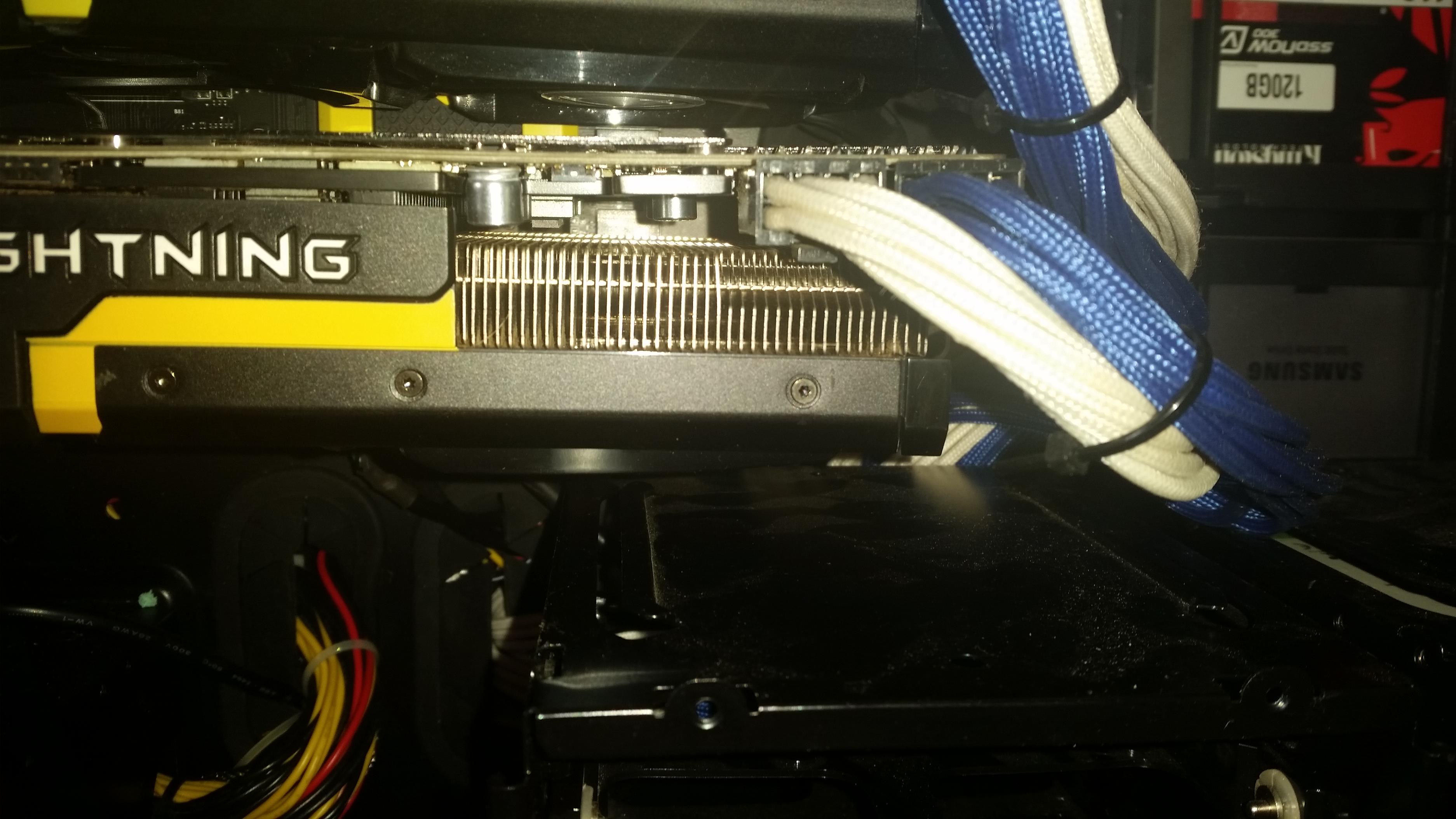 Meine GTX 780 mit Prolimatech Mk-26 musste ich mit Kabelbinder am Gehäuse fixieren, die war mindestens 5cm nach unten gebogen. Karte funktioniert(e) trotzdem einwandfrei.