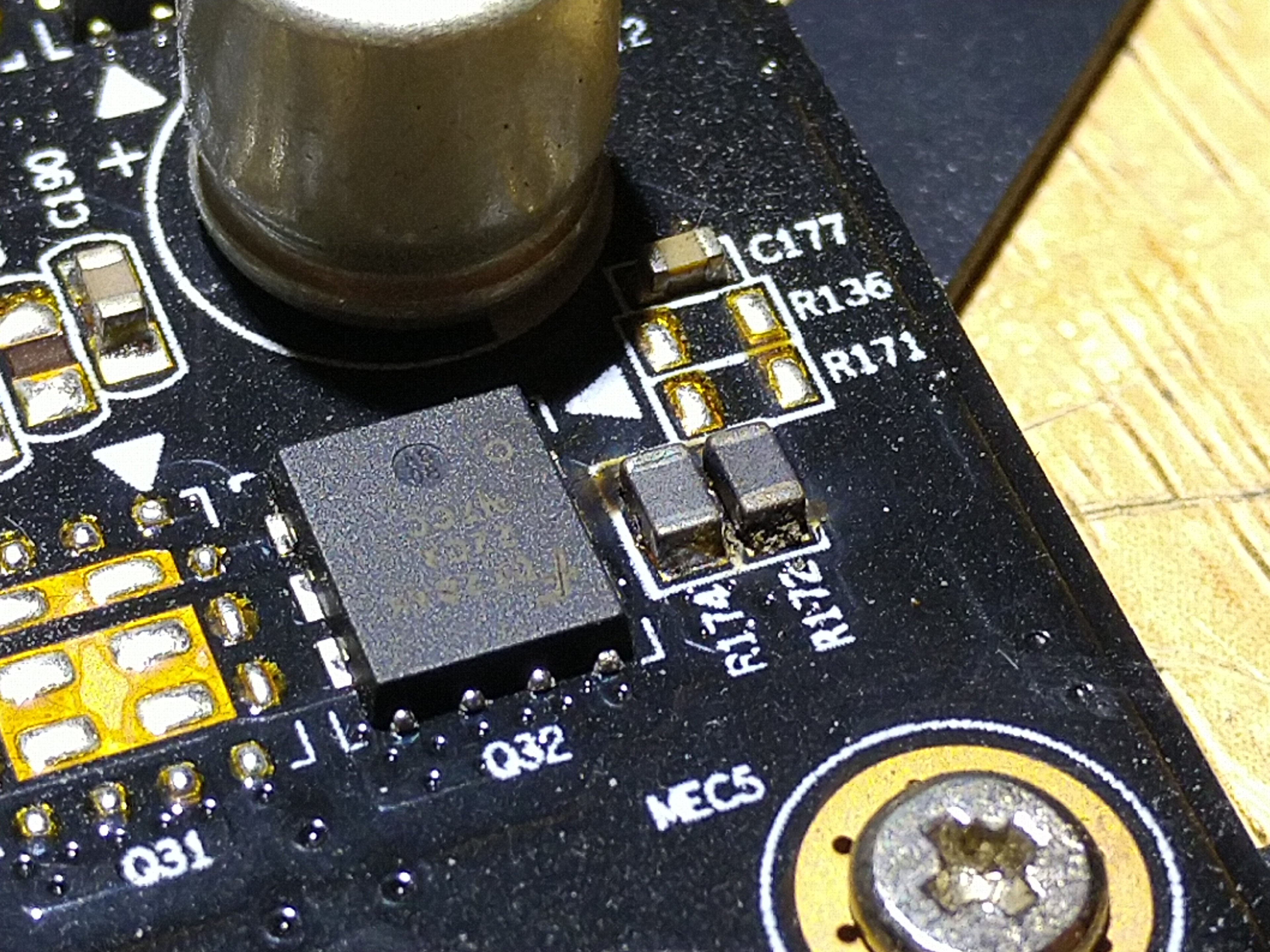 Messtechnisch war aber erstaunlicherweise der untere DualN Mosfet noch heile, auch die Gate Pins sahen messtechnisch sauber aus. Also kurzerhand wie immer die beiden defekten SMD Filter getauscht gegen eine SMD Sicherung, damit auch da etwas Sicherheit ist falls der Mosfet sterben sollte