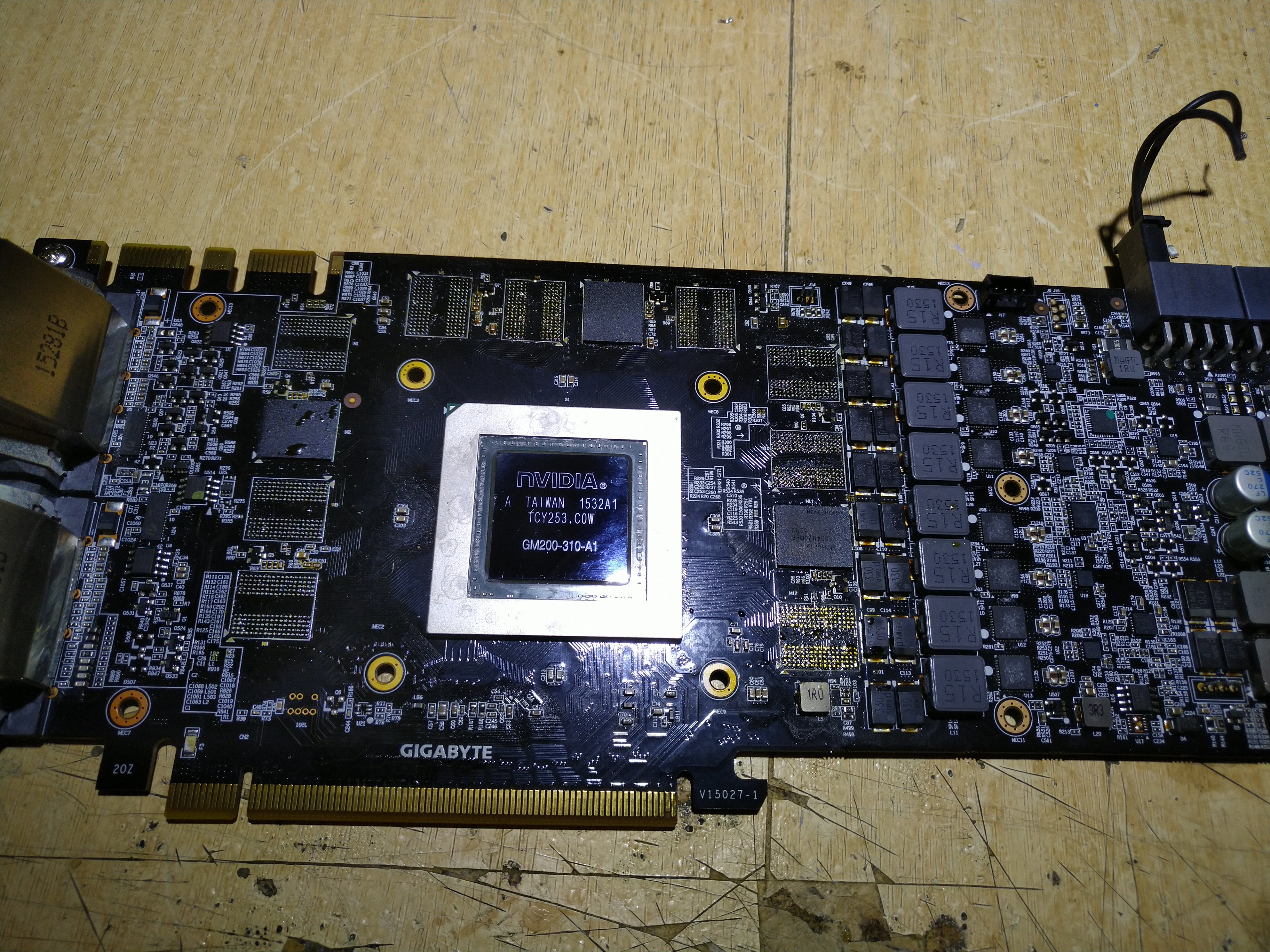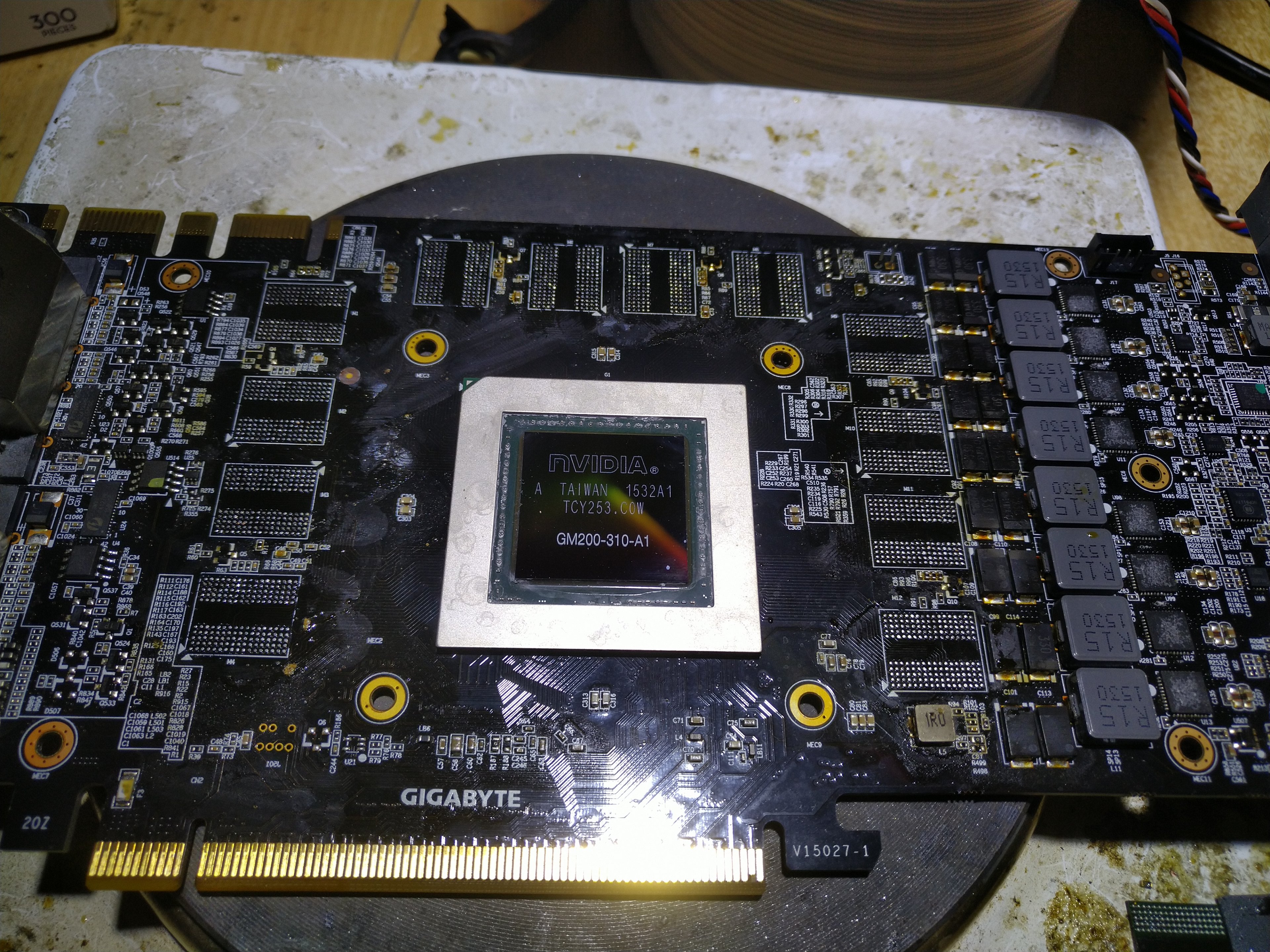 Ich hatte es @Zaiga ja angeboten über seine karte zu schauen, da ich mit den Gigabyte 980ti karten schon recht viel Erfahrung habe. Also hab ich sie mir auch kurzerhand mal angeschaut und mich gleich zur berühmten stelle vorgearbeitet wo es eigentlich immer nen schaden gibt. Zu 80% ist bei der Gigabyte 980ti Windforce oder Gaming G1 die untere vMem Phase unten rechts in der ecke defekt, genauer gesagt die zwei SMD Filter welche mit der zeit hochohmiger werden...