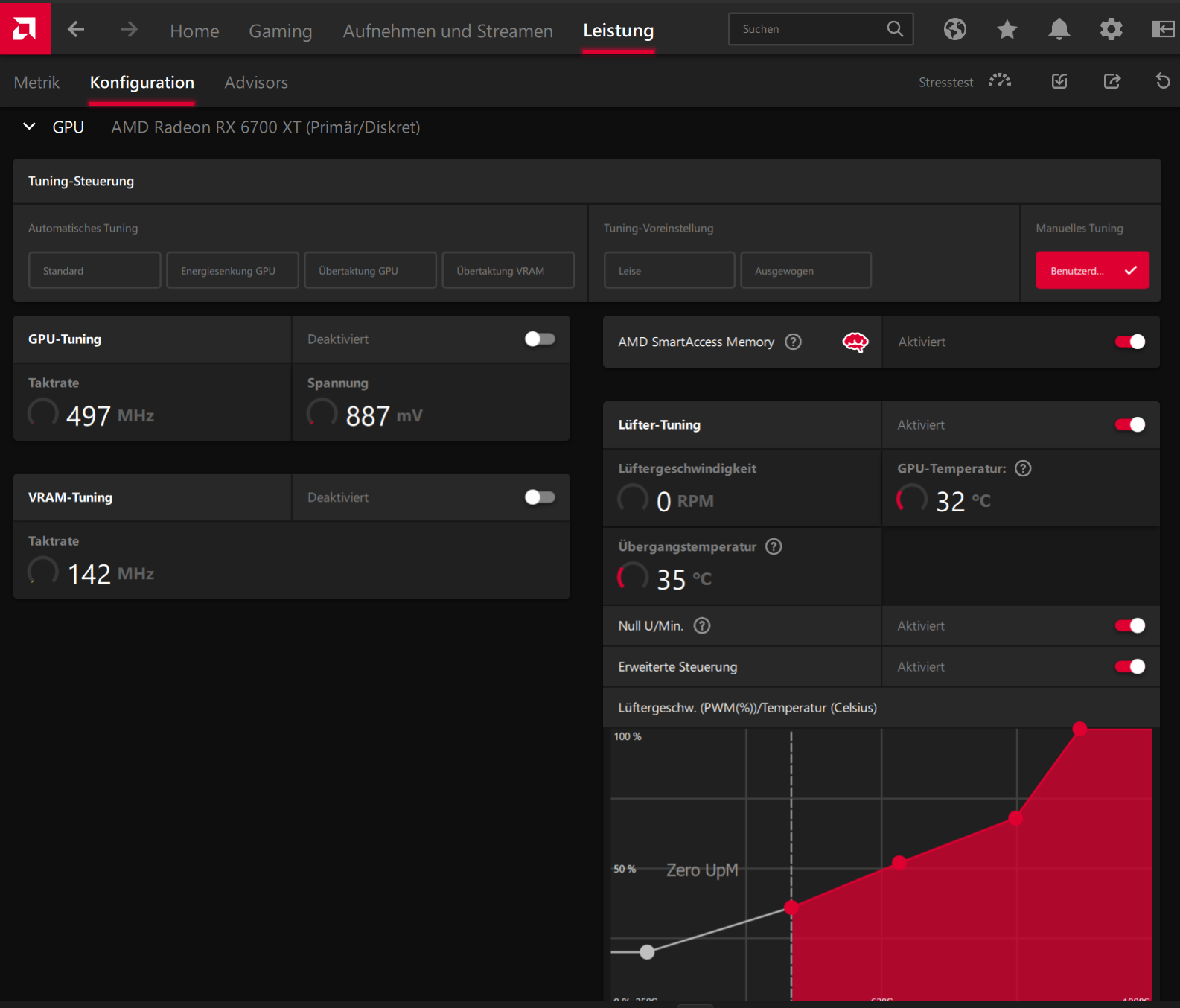 habe heute meine alte GTX 1660 super gegen meine neu RX6800 ausgetauscht. Nach 5 min ohne das ich irgendein programm gestartet habe hatte sie schon eine Temperatur von knapp 60 Grad. Die Lüfter fangen erst bei 66 Grad an Zu drehen. Mir kommt das sehr komisch vor, meine alte Grafikkarte hatte sonst eine Temperatur von vielleicht 45 grad auch wenn die Lüfter sich nicht gedreht haben. Ist das normal oder muss ich mir Sorgen machen?