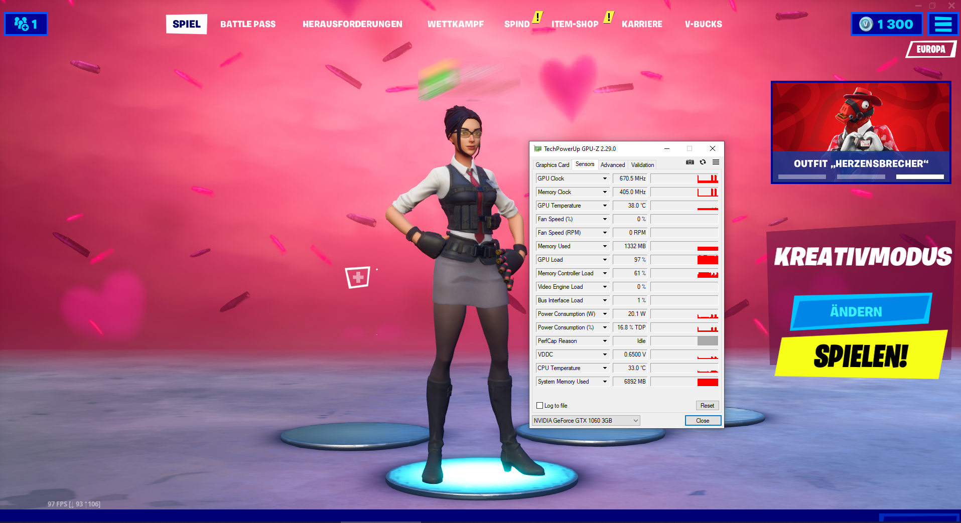 Die Grafikkarte ASUS Dual GeForce GTX 1060 OC taktet in 3D nur für etwa 1 Sekunde auf Volltakt (1847 Chiptakt und 4000 Mhz Speichertakt). Danach taktet sie auf etwa 600/840 Mhz herunter und zwar für den gesamten Zeitraum der Anwendung. Die FPS fallen massiv, in Fortnite zb. von 144 auf 40.
