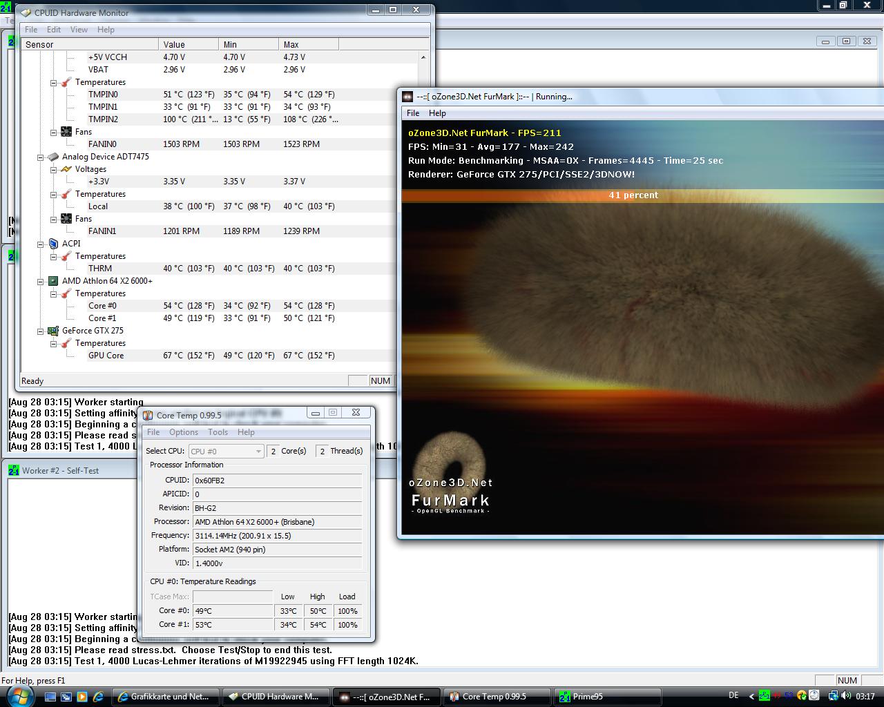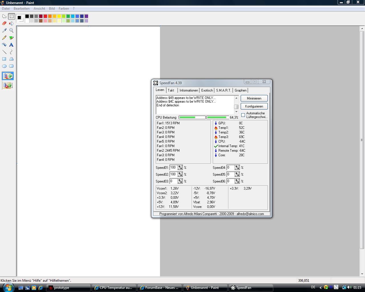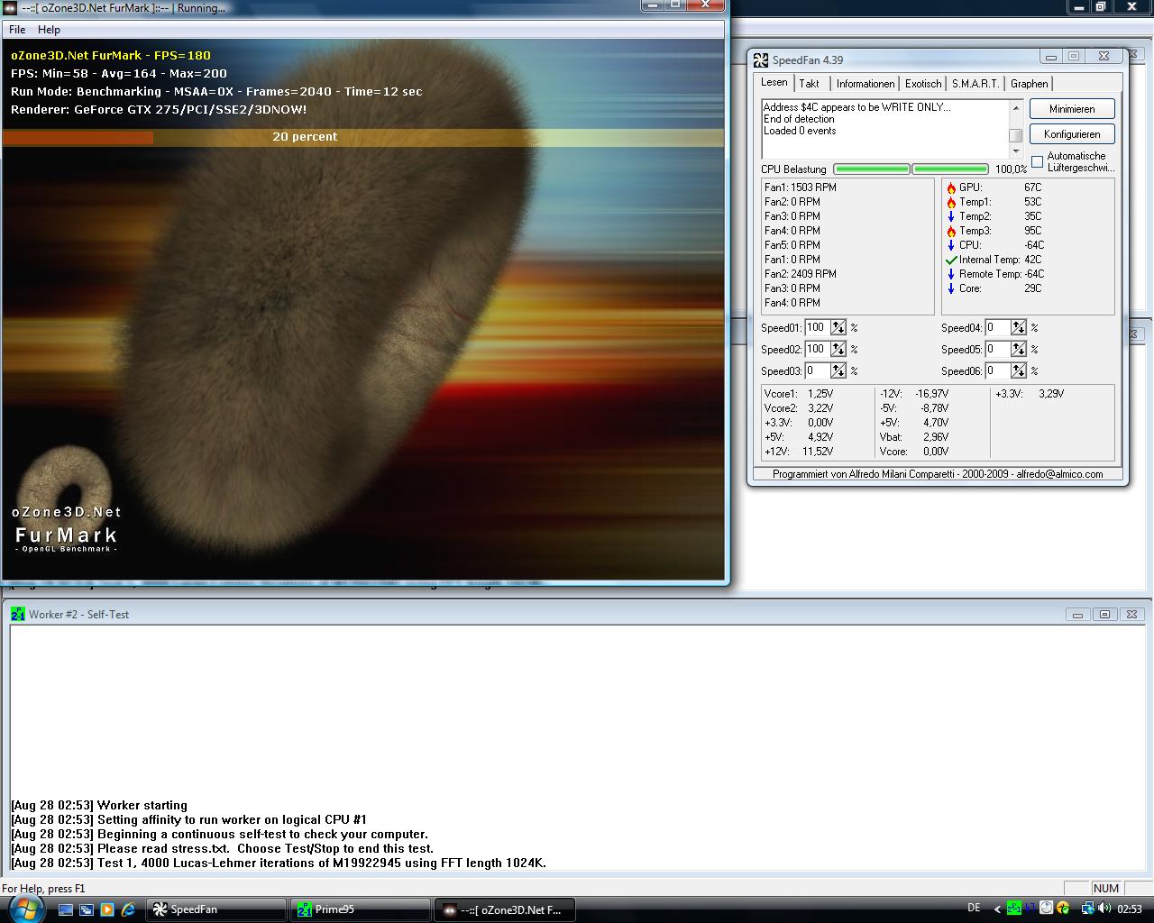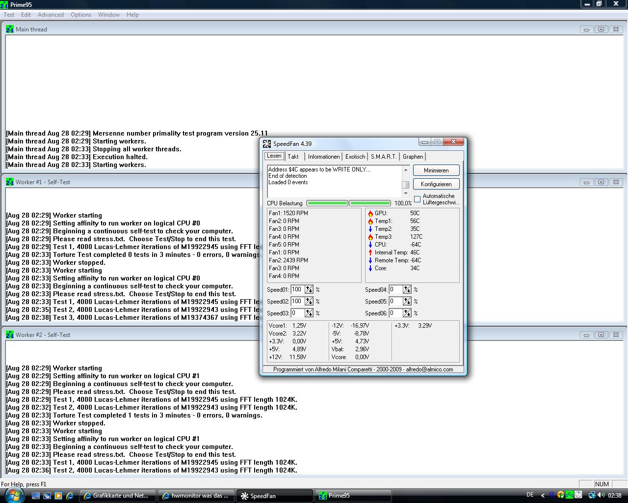 mein problem jetzt wenn ich in prototype bin oder in wolfenstein also spiele passiert es ab und zu das mein pc von einer sekunde auf die andere sich ausschaltet passiert mal nach 5 minuten mal nach 1 stunde er fahrt nicht runter oder so sondern einfach nur komplett aus als würde man den strom stecker ziehen ich kann ihm problemlos wieder an machen kann das vielleicht daran liegen ich habe ein 550 watt netzteil allerdings war das auch wirklich günstig zu der zeit mit 40 euro no name teil^^ und die grafikkarte braucht ja minimal 550Watt ich habe voher damit meine Asus 8800 GTX in betrieb gehabt protoype war kein problem oder liegt es vielleicht an dem neuen cpu kühler das mein cpu zu warm wird ich habe noch 2 screens um zu zeigen wie meine temp. wärend des spielens ist und am desktop ist hoffe ihr könnt mir bitte bitte helfen