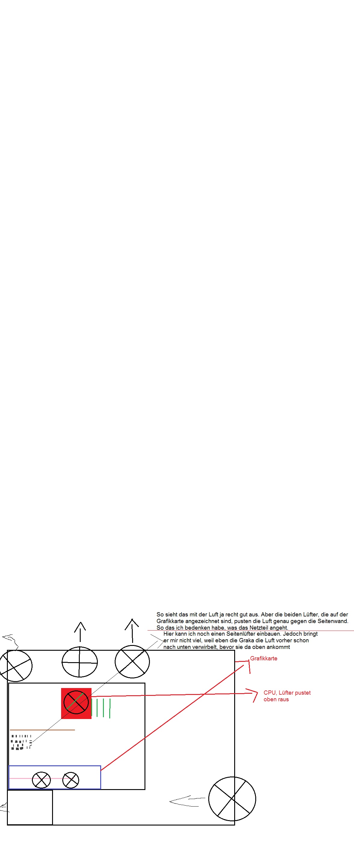 Denn meine Befürchtung wäre, das die Grafikkarte die Warme Luft nicht nur nach oben verteilt, sondern durch den Druck wie die Luft da rausschießt, auch auf das Netzteil und in die Ritzen, die da zwischen dem Netzteil und der Gehäuseseite sind.