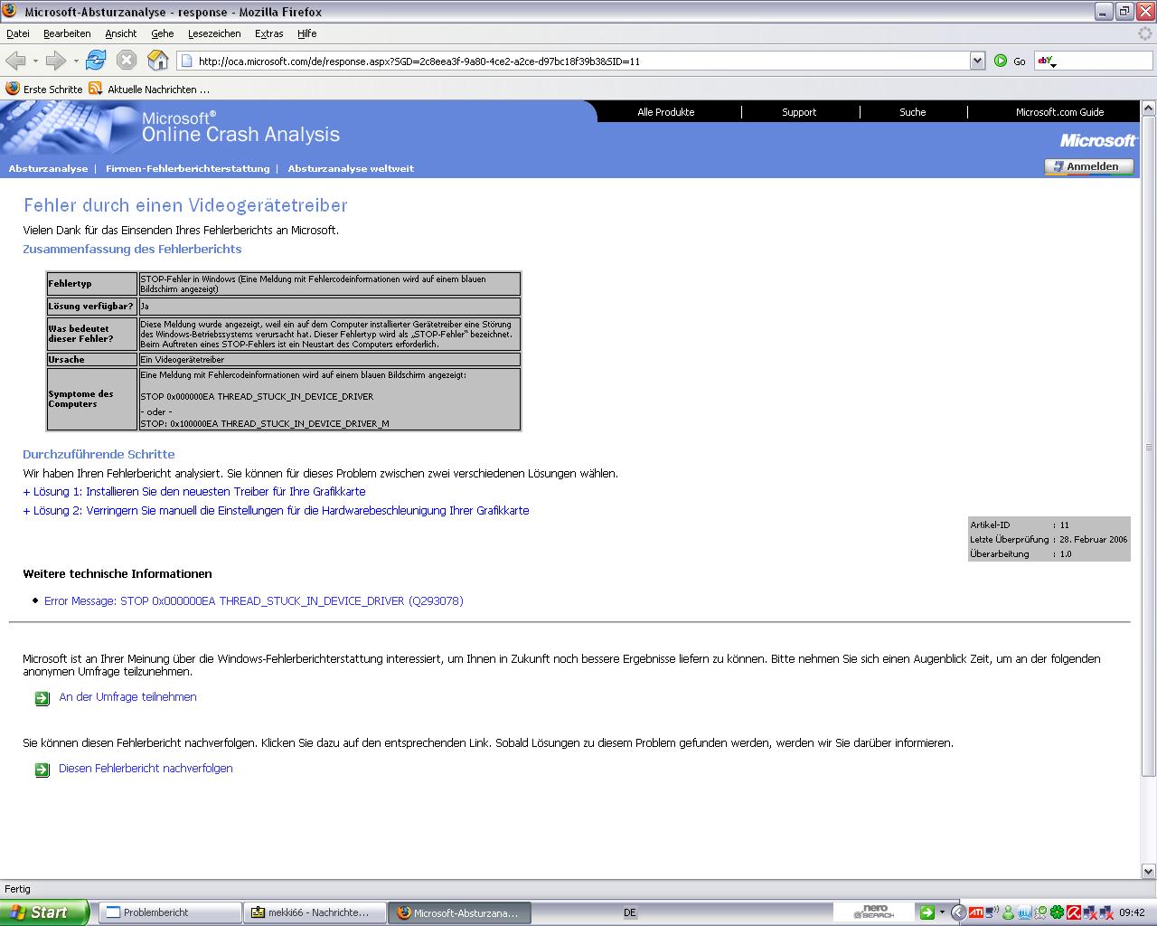 Ich hab folgendes Problem und zwar geht es um einen Fehler, der immer wieder auftritt beim versuch den PC zu booten, es kommt der anmelde Bildschirm von Xp mit der Passworteingabe und dann erscheint das Desktop, er will laden und zack geht er wieder aus und bootet erneut. Dieses Spielchen macht er bestimmt 10-15 mal ehe er dann auf einmal fukntioniert. Dann erscheint jedes mal das Windows Problem Fenster, wo mir dann folgender schwerwiegender Fehler angezeigt wird (Siehe Bild). Liegt es an der Grafikkarte oder am RAM Speicher, wie ein Kumpel meinte? Anzumerken ist noch das ich den ATI Catalyst 6.9 drauf habe! Und die Hardwarebeschleunigung steht im System auf max. ebenso wie die Qualitätseinstellungen im Catalyst Treiber selber für die Grafikarte!