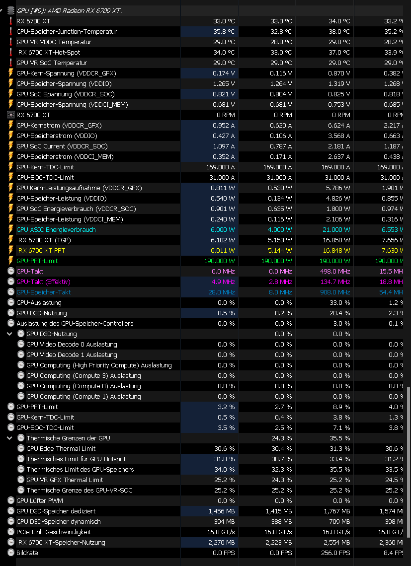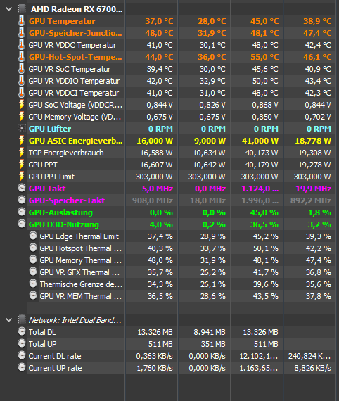 ich habe eine kurze Frage zu meiner Grafikkarte, und zwar passiert es recht häufig das ab einem nicht definierbaren Zeitpunkt der Speichertakt nicht mehr angezeigt wird und ich das Gefühl habe, dass dafür das die Karte im idle läuft der Speicher ungewöhnlich warm ist. Ich meine mich zu erinnern, dass dieser in der Vergangenheit etwa 2-4 Grad über der Temperatur der Karte lag bzw. der des Chips und nicht wie aktuell oft 10-12 Grad drüber. Ich hänge euch mal zwei Screenshots an. Über ein Feedback würde ich mich sehr freuen.