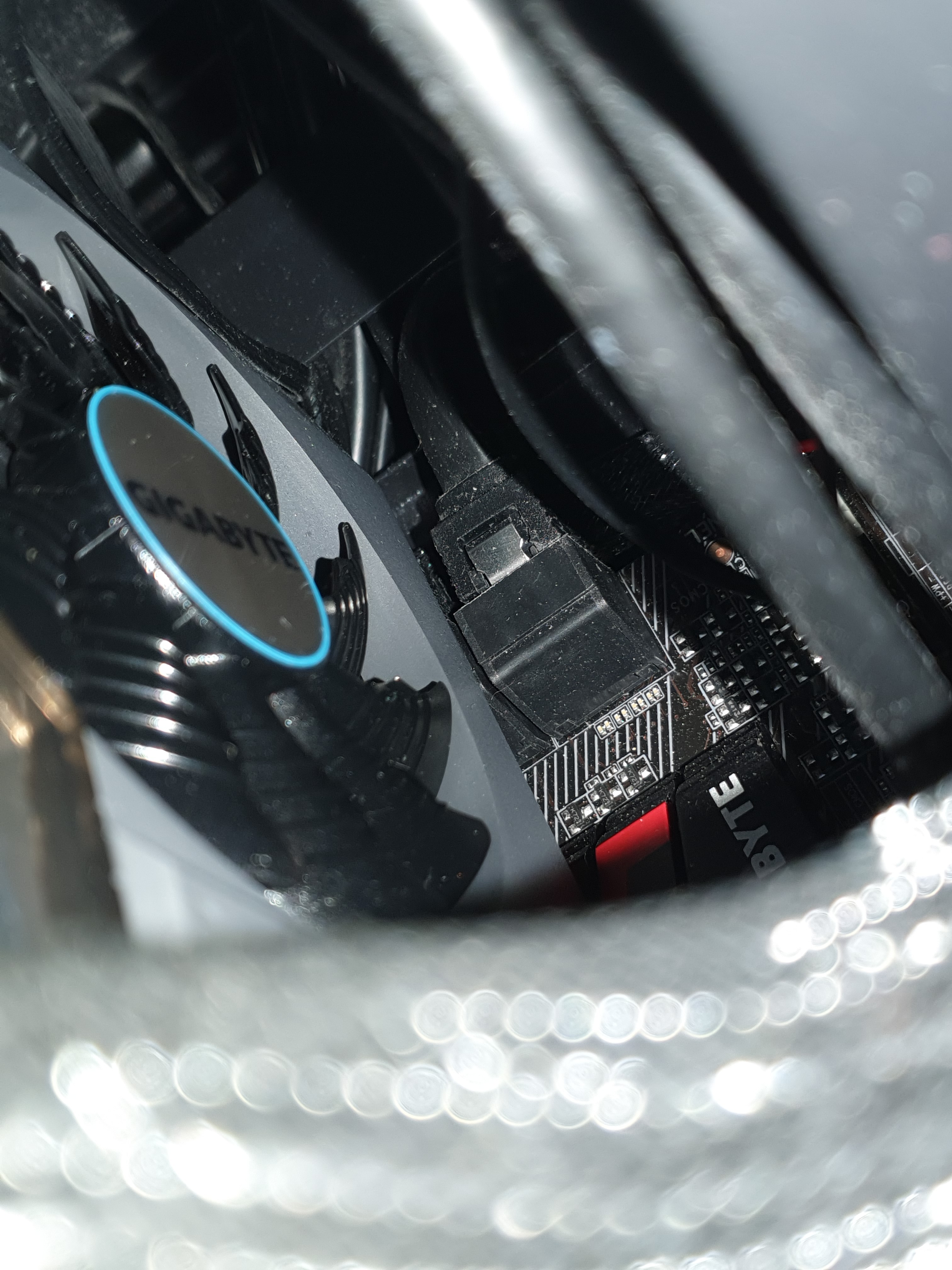 Ich habe mir eine neue Grafikkarte zugelegt, die ist nun um einen Lüfter länger als die alte und ragt daher über den Chipsatzkühler und kommt beinahe an die S-ATA-Ports ran.