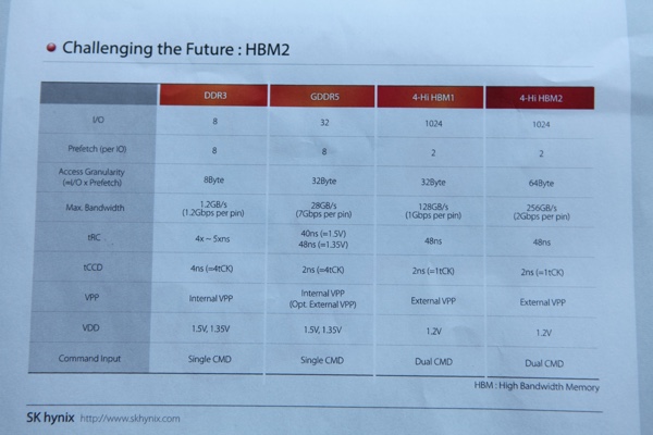 ...Die nun aufgetauchten technischen Daten von HBM2 zeigen für die zweite Ausbaustufe von SK Hynix 8 GBit pro Core-Die-Layer. Diese können in vier oder gar acht Lagen gestapelt werden, so dass der Speicherausbau pro Chip-on-Wafer bei 4 bzw. 8 GB liegt. Die Speicherbandbreite verdoppelt sich auf 256 GB pro Sekunde. Es bleibt bei der relativ geringen Spannung von 1,2 Volt. Das Ausstellen von SK Hynix auf der GTC 2015 ist wohl der deutlichste Hinweis, dass der 3D Memory der "Pascal"-GPU von SK Hynix stammen wird, was im Zusammenhang mit HBM2 auch Sinn machen würde.