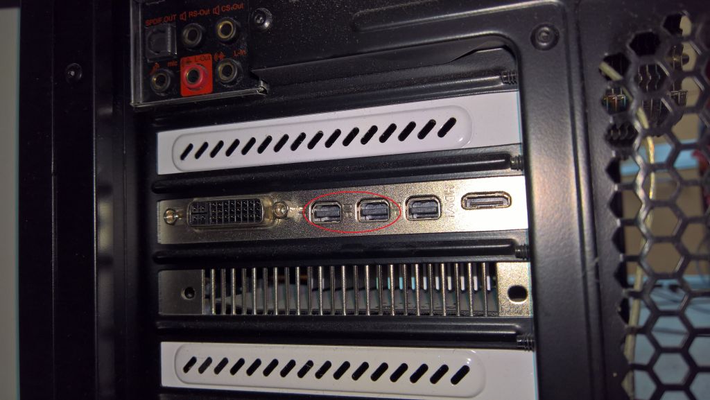 Alle Anschlüsse funktionieren, jedoch die Rot eingekreisten nicht. Auch nicht mit den selben Kabeln die am ganz rechten Mini DP Port angeschlossen sind. Es ist einfach so, das die Endgeräte nicht erkannt werden.