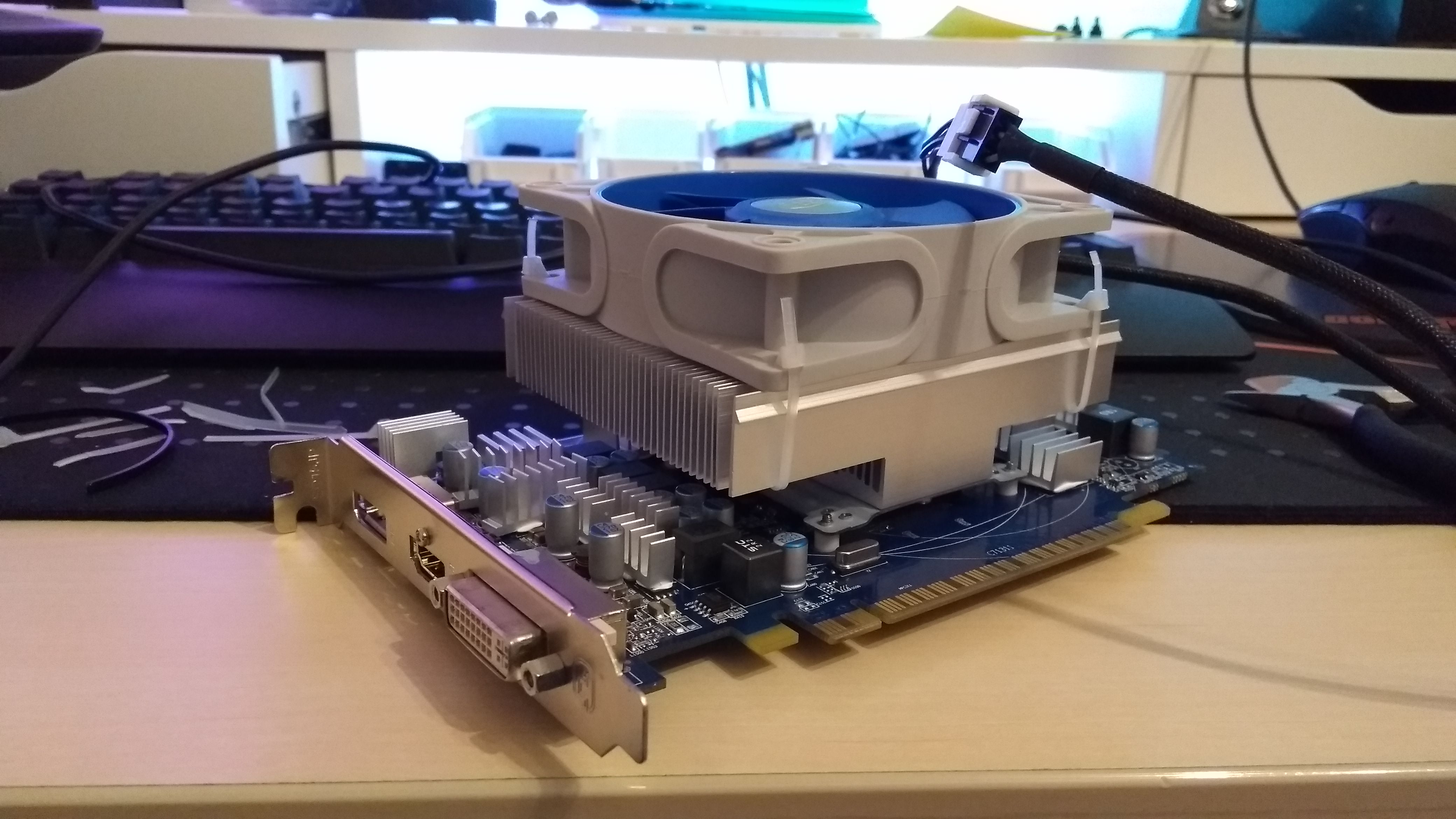 Wenn der Grafikkartenlüfter rattert und man kein Geld in eine fünf Jahre alte Karte investieren möchte. Ich hätte lieber einen 92mm-Lüfter verbaut (da verschraubar), aber von denen hätte keiner mit der Lüftersteuerung harmoniert. Immerhin ist's angenehm leise.